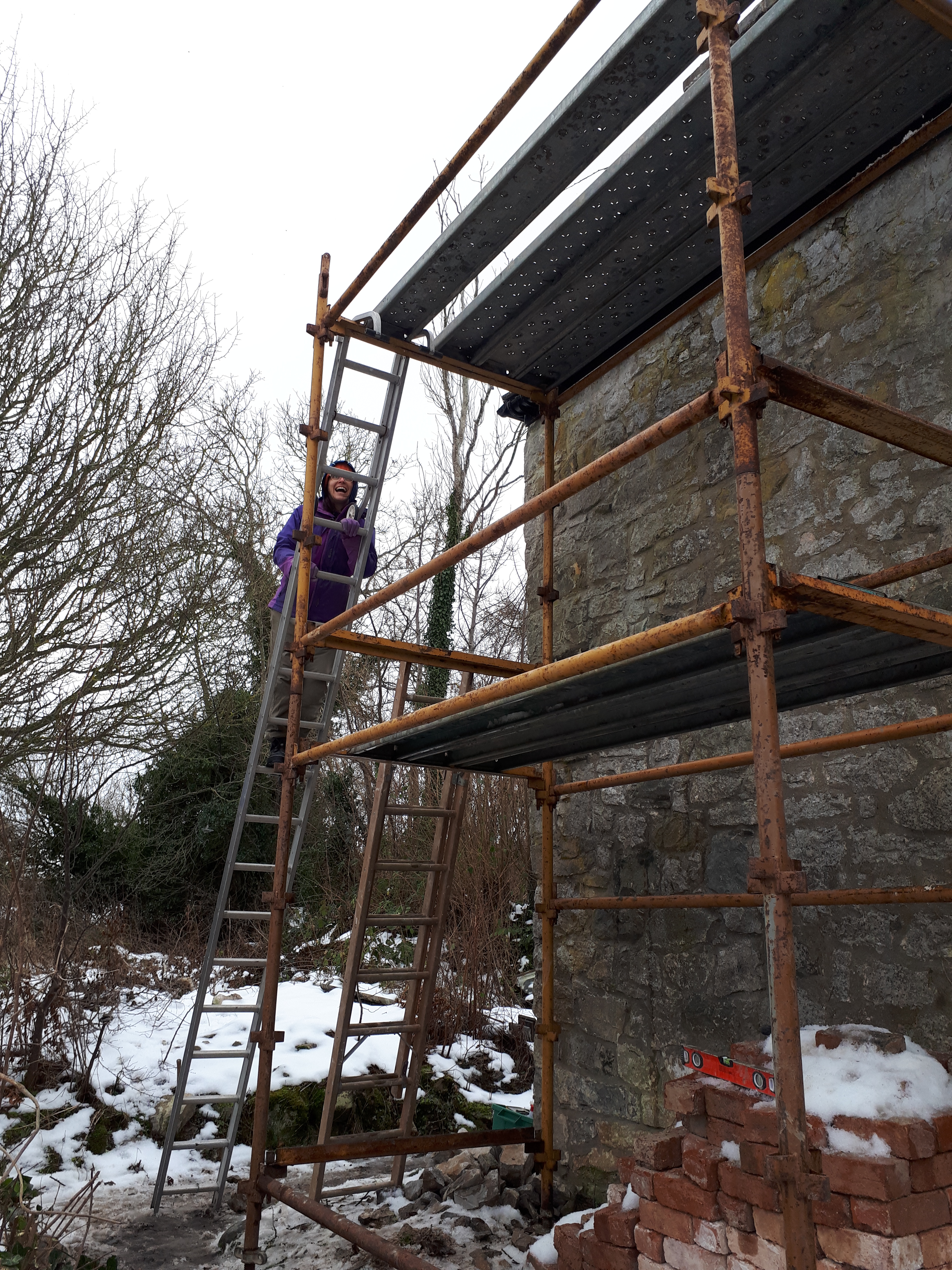 On the Sunday, Luke and Anna were dragged back for more work, while Jay was let off for good behaviour. Having celebrated the dismantling of the scaffolding a few weeks before, Chris and Luke were forced to rebuild a tower in order to inspect the chimney. A slight damp wall below has made us aware that the lead around the chimney still has a slight leak.