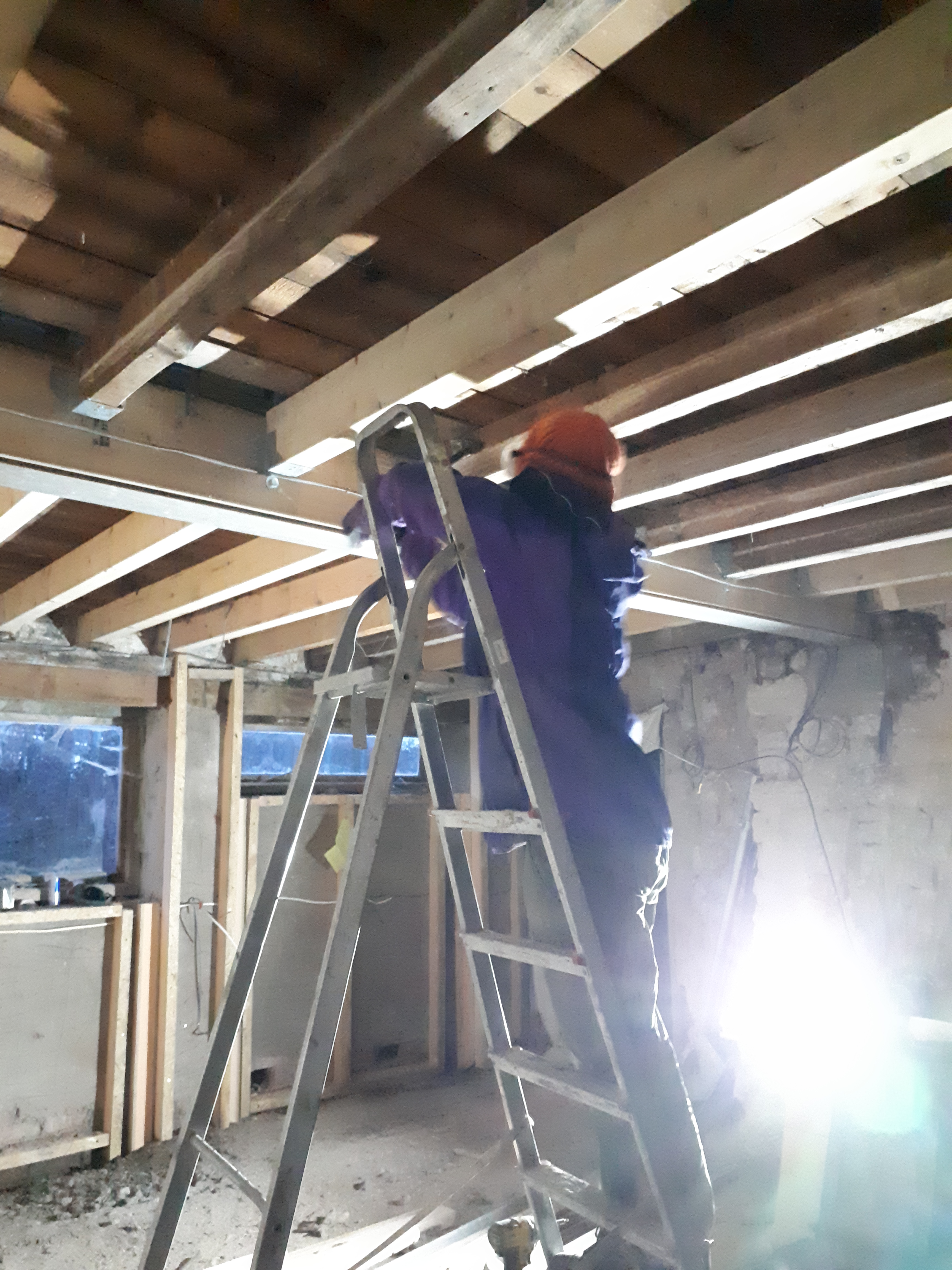Finally, myself and Anna began to put up the batons on the beams in the kitchen/diner, ready for the new ceiling to go in.