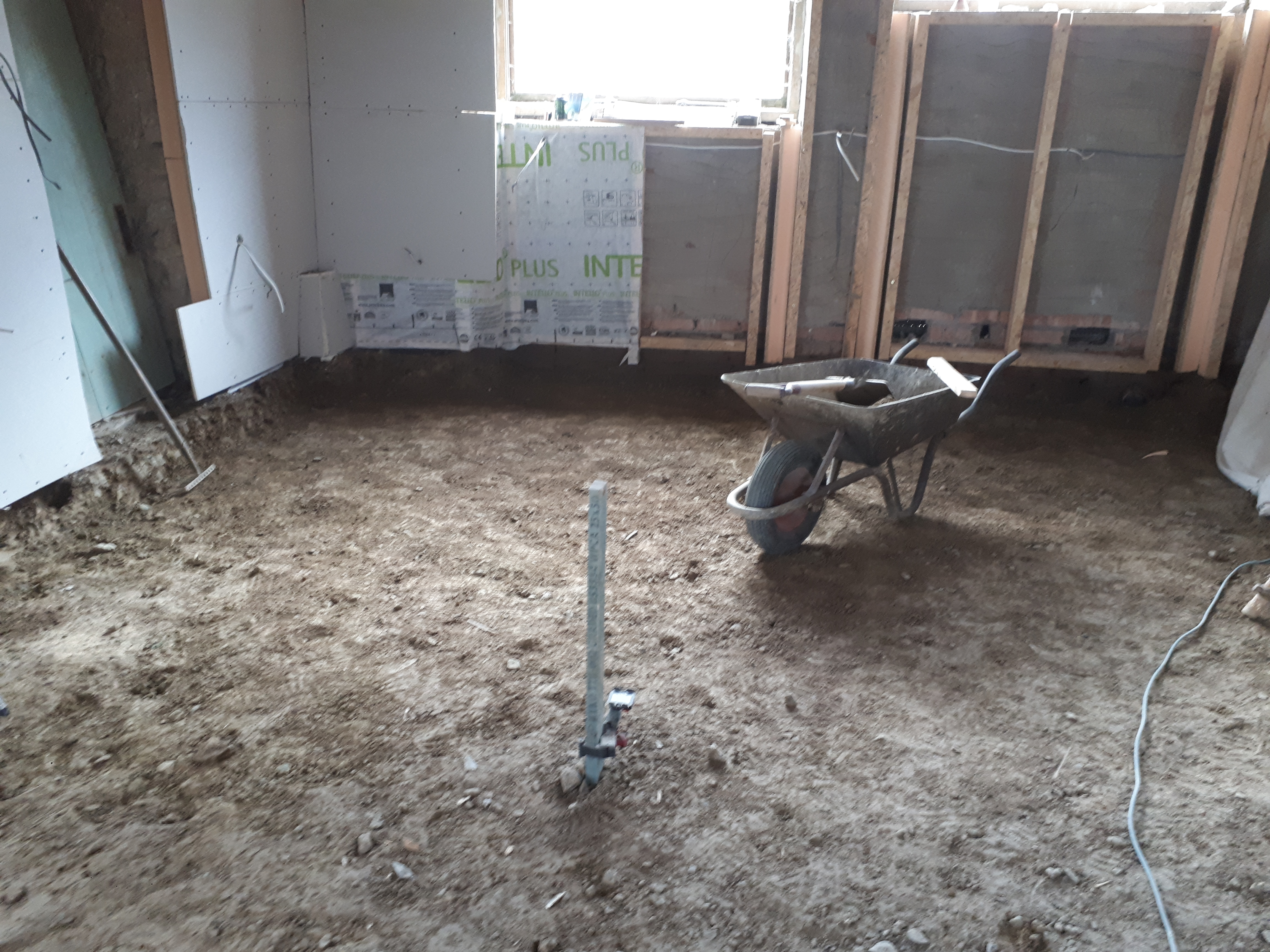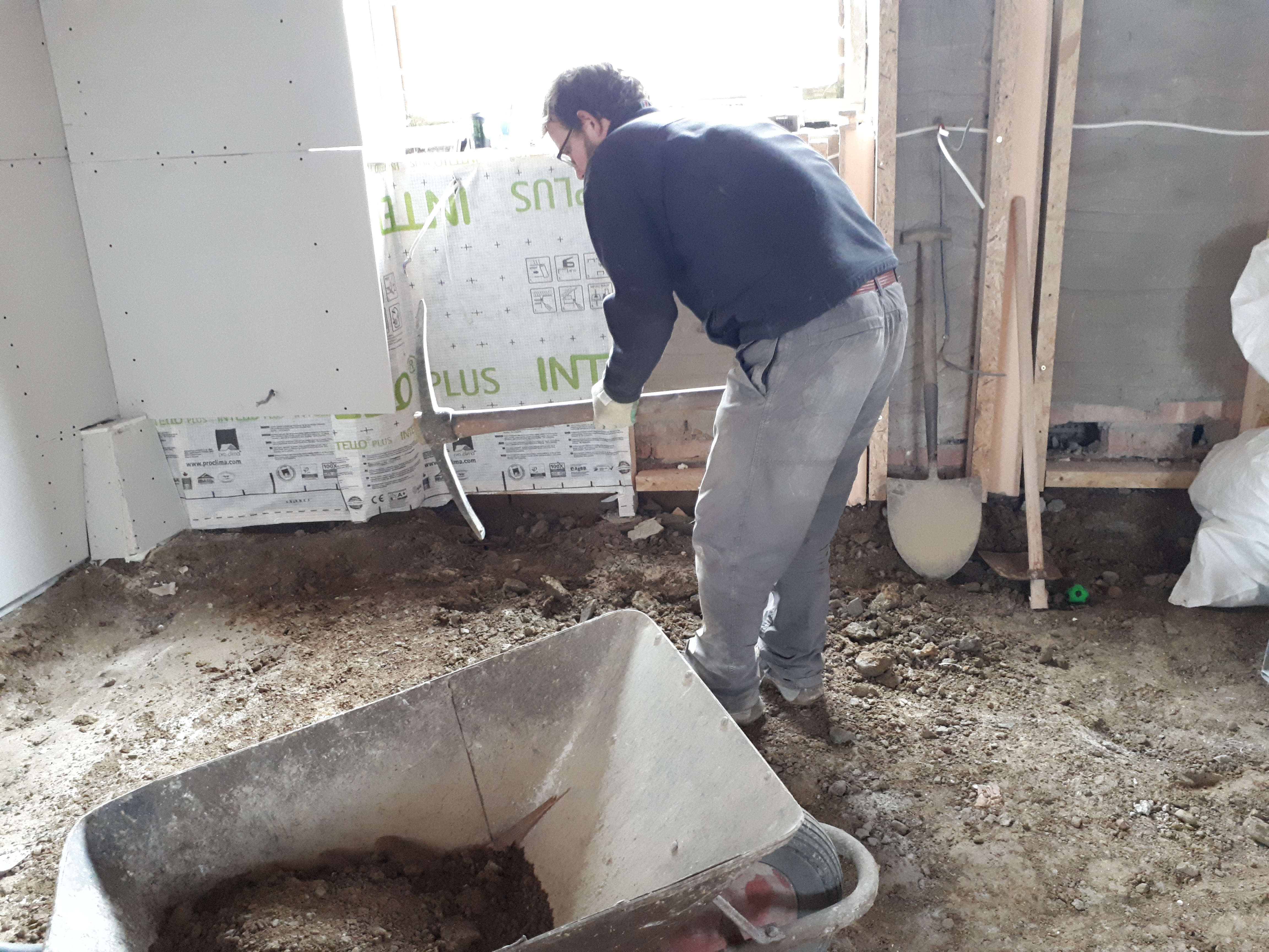 But of course much of the weekend was spent continuing with digging the floor. While the previous weekend’s digging had been physically hard, this weekend’s had an added mental strain. In order to have space for all the material going on top we needed to dig down a minimum of 18cm, ideally 20cm. While this seemed to go fairly well on half the floor, the other half just refused to go any deeper. We measured it at 15cm, and then dug and dug through the tough ground, moving one wheelbarrow after another. Stopping to measure and….15cm. Sigh.