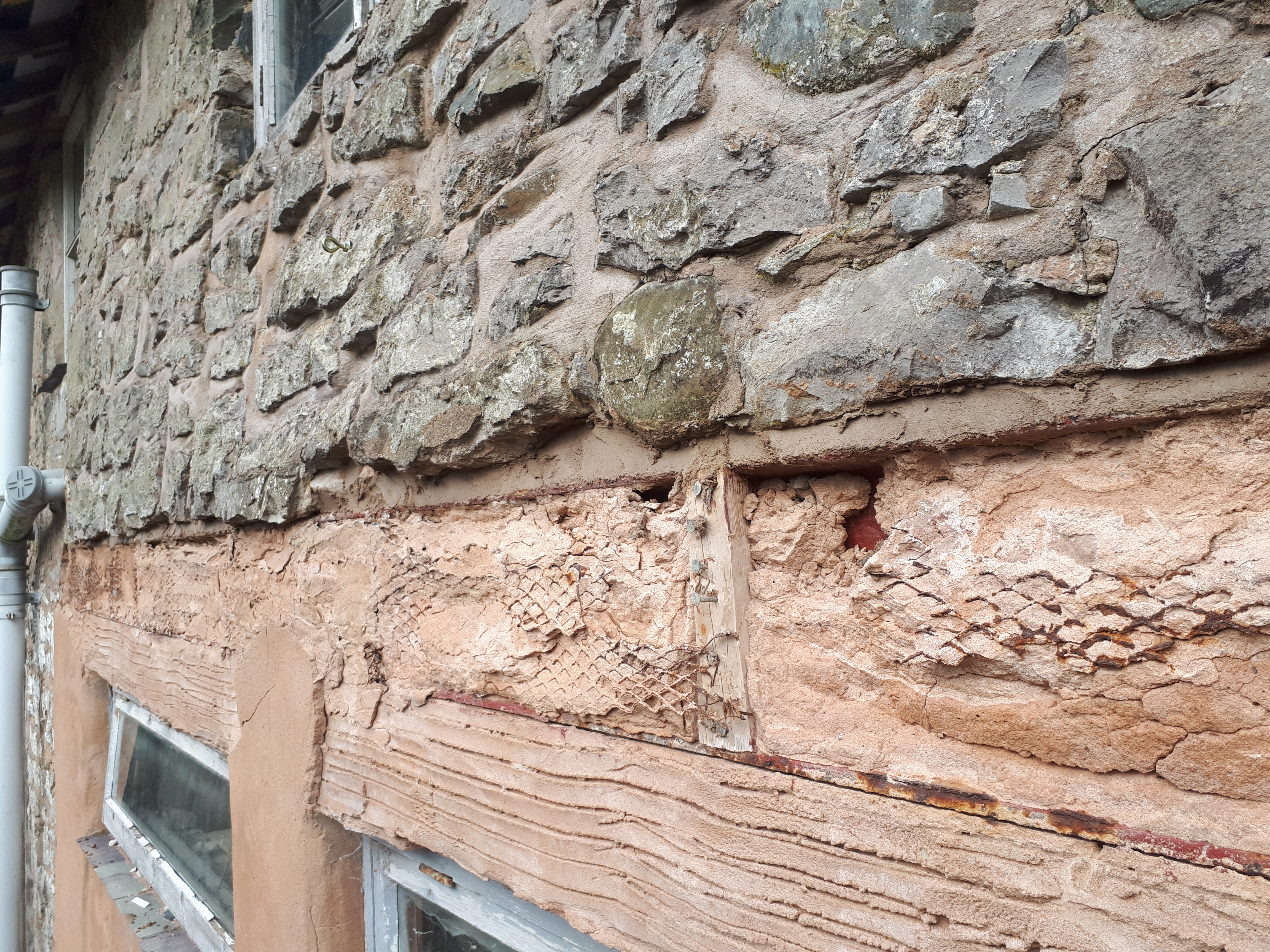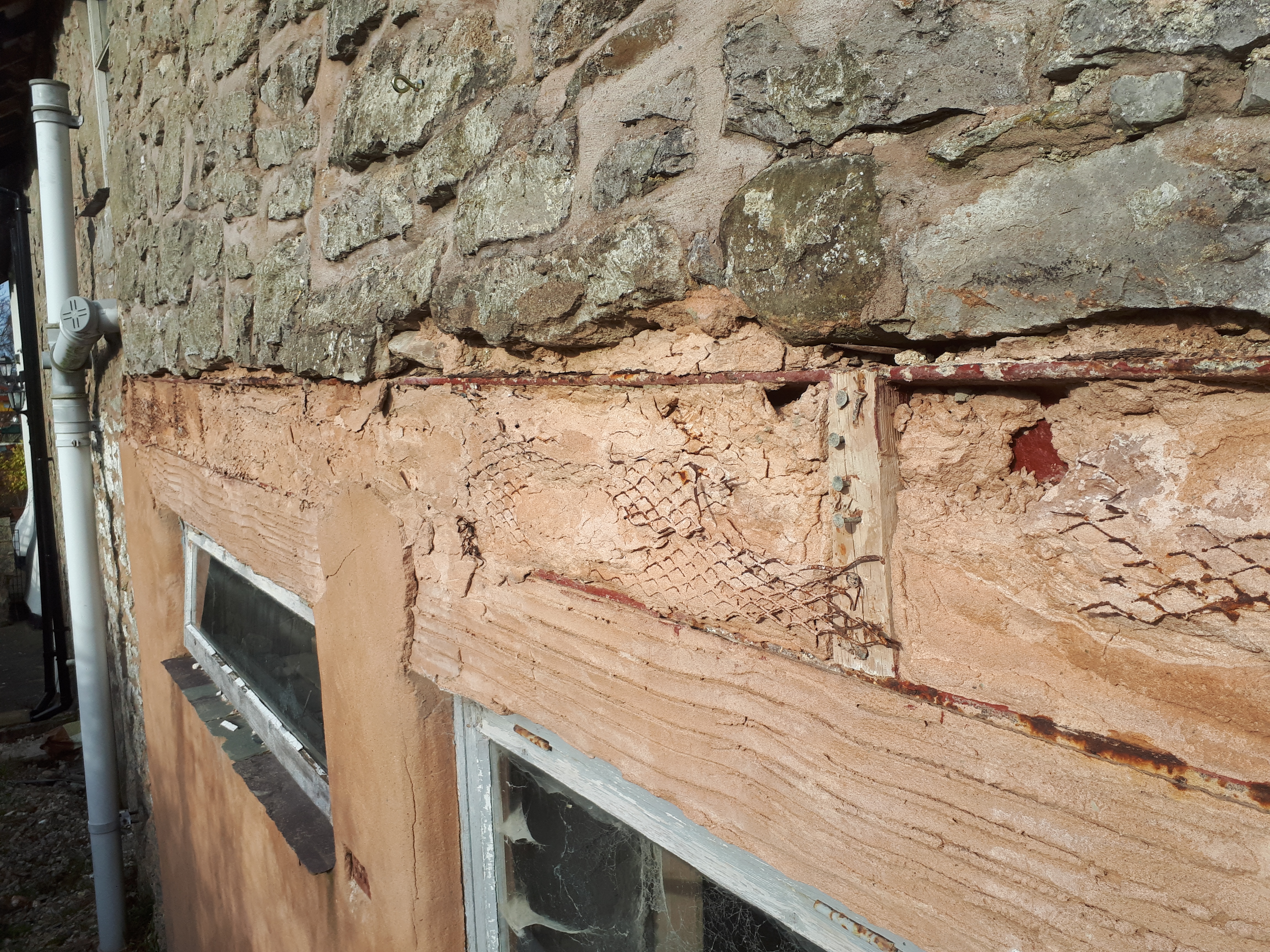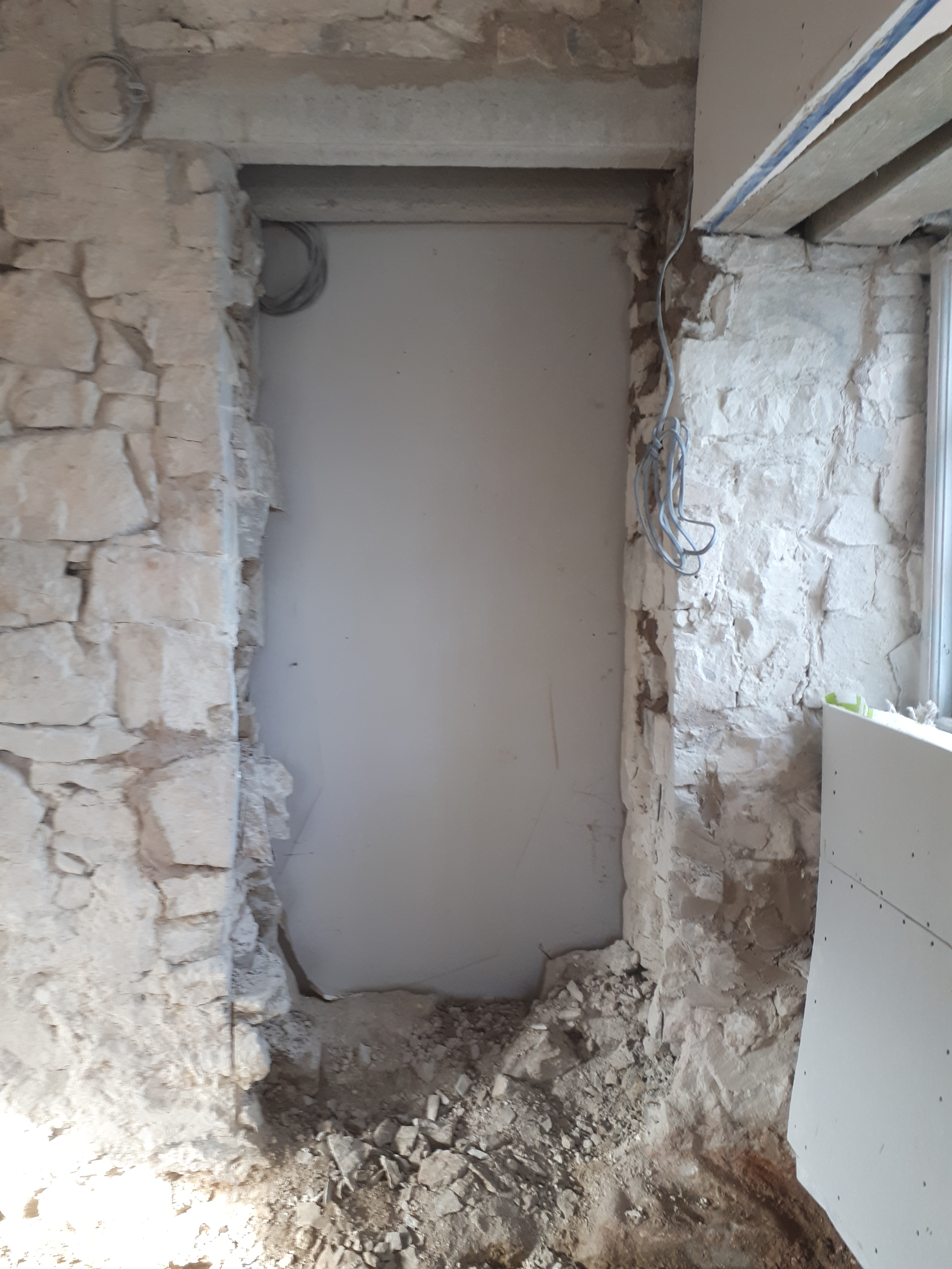 In order to avoid the dust being created by Chris’s work on the new doorway, I headed outside to plug some holes above the old steel in the back wall. At the moment this steel is rusting, as it hasn’t been properly protected from the weather. The rusting steel has the swollen, lifting up the stones above. As they lifted this has caused the various cracks in our back wall. In the long-term we need to decide what to do about this steel, but for now I spent some time scraping out the soft mortar and filling gaps, to help prevent water seeping into the wall, and causing further rusting.