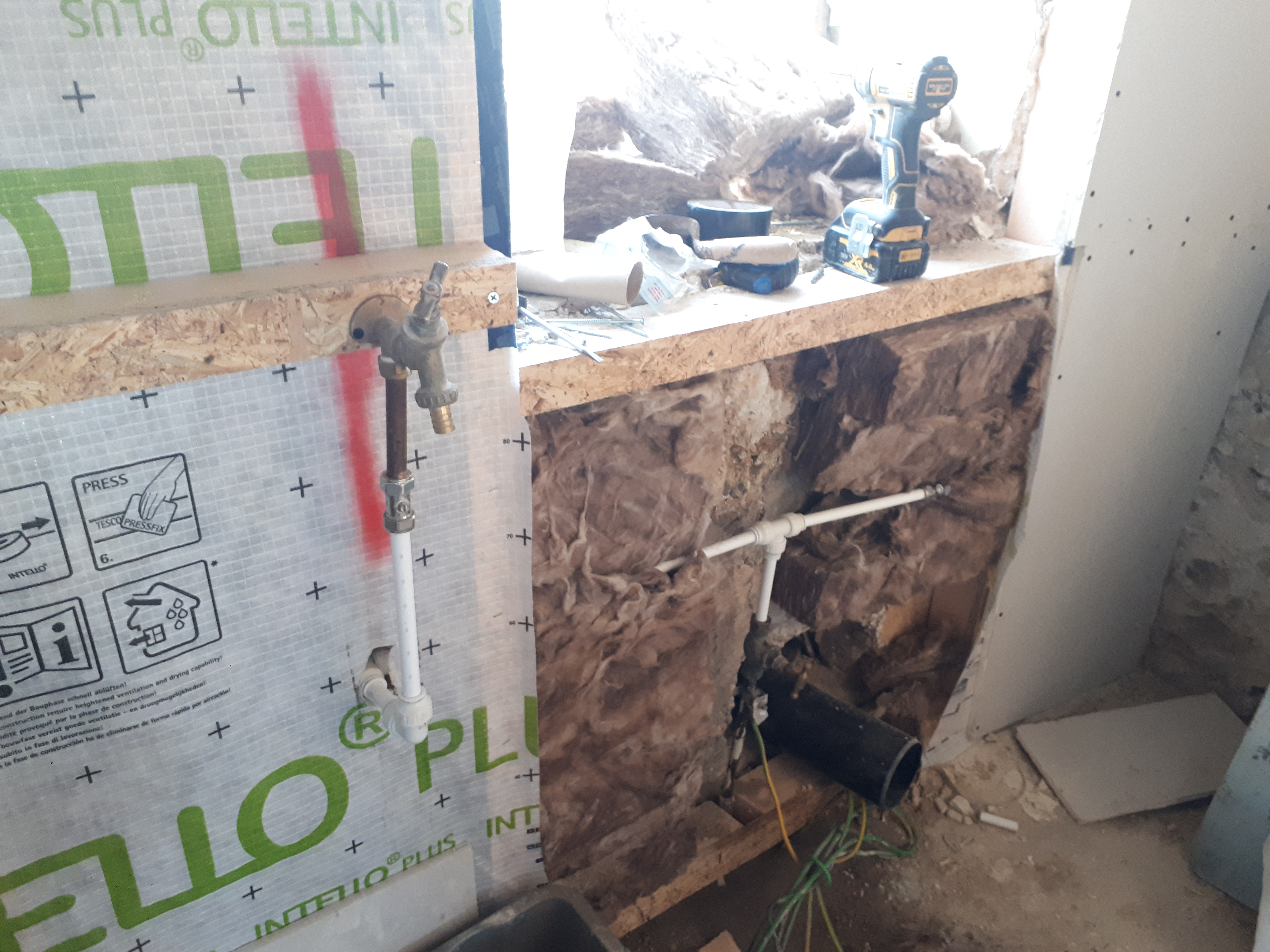 During the insulation installation the tap pipe in the old kitchen was bent, meaning the section needed to be replaced. Chris spent a bit of time planning out where the sink and toilet would go in this room before installing a new tap.