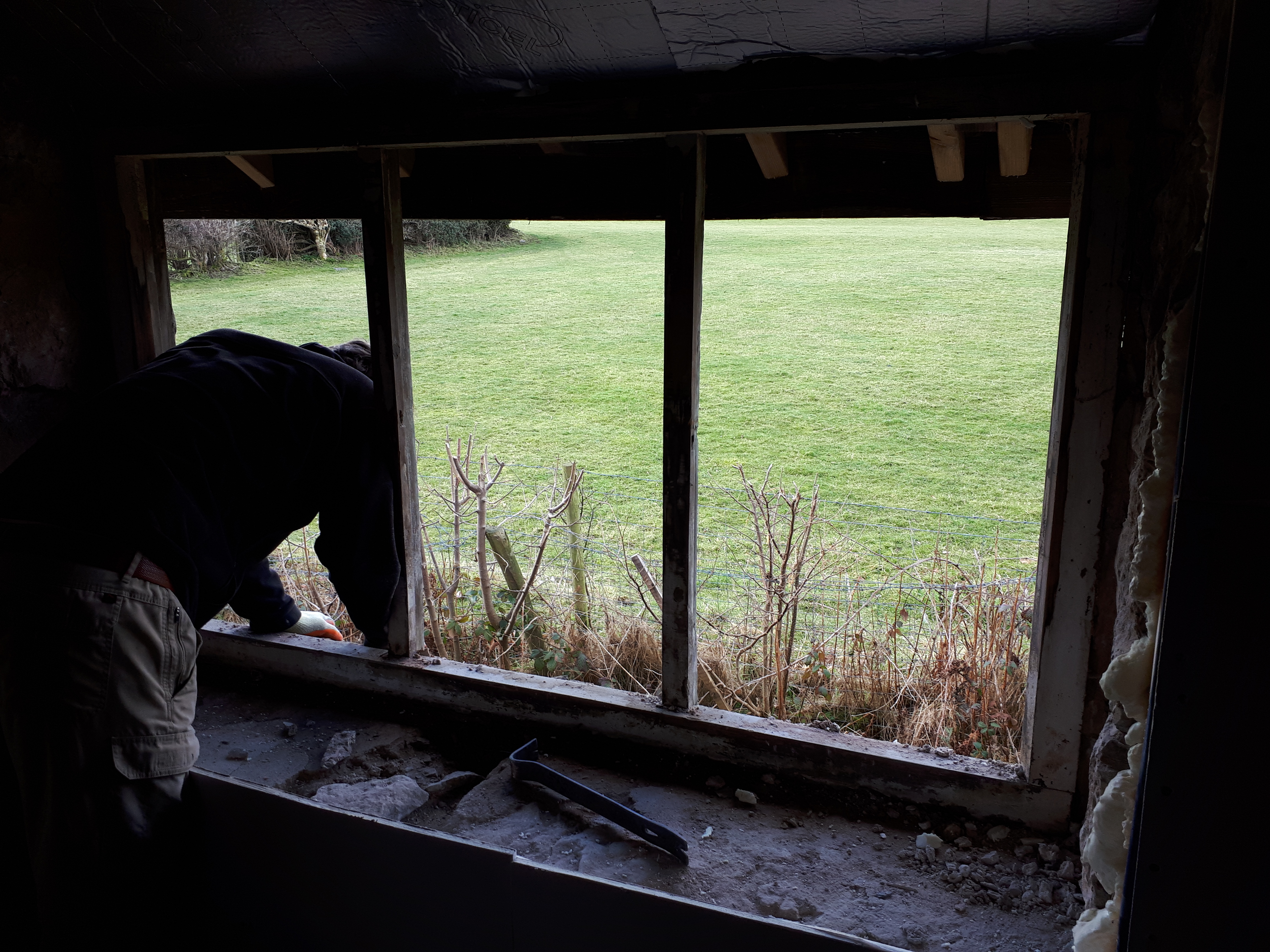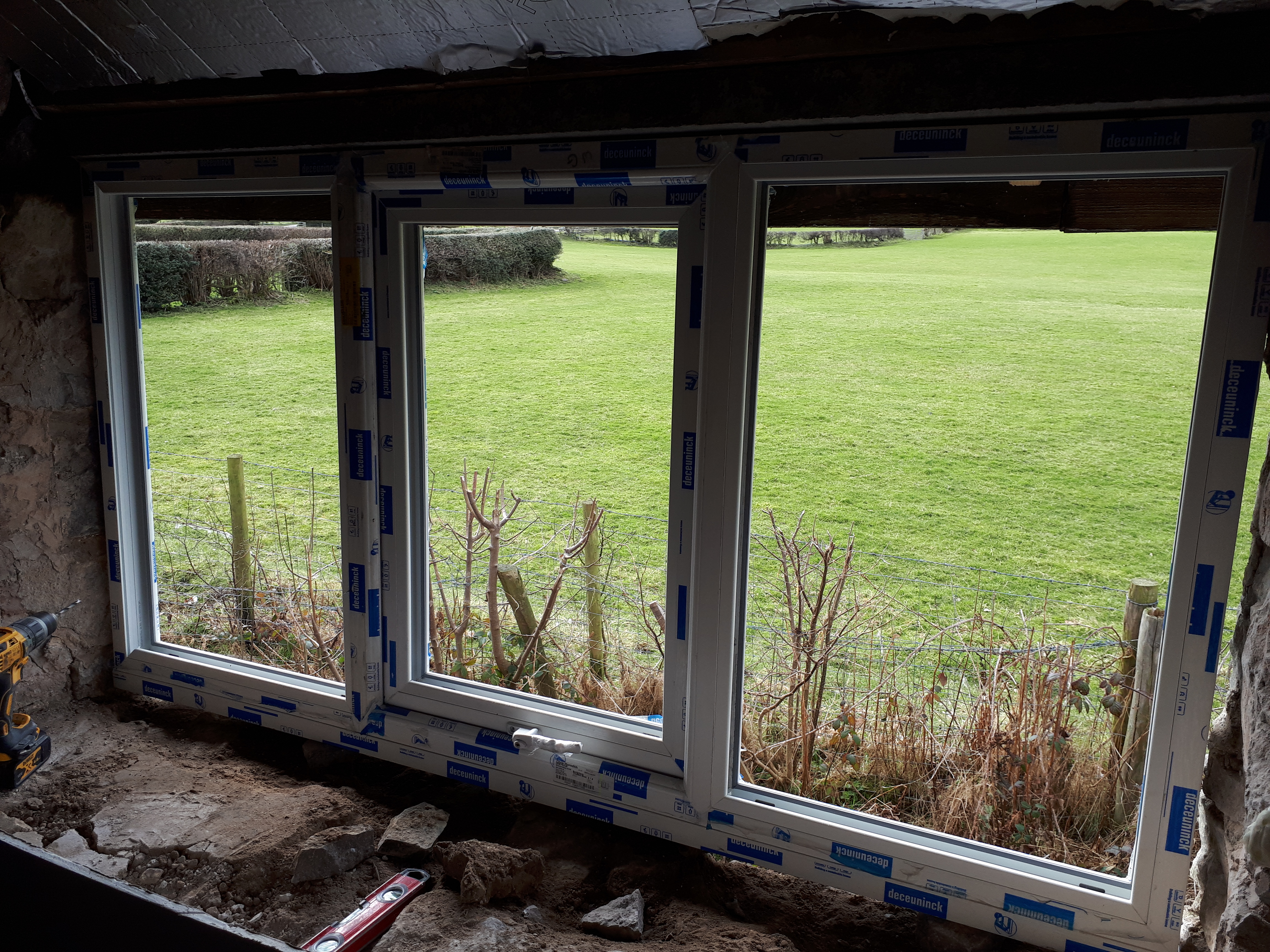So we set about installing the last two PVC windows. The first went in relatively easily, though it took quite a while to break up the two large stones either side of it, in order to get the lintle in place.