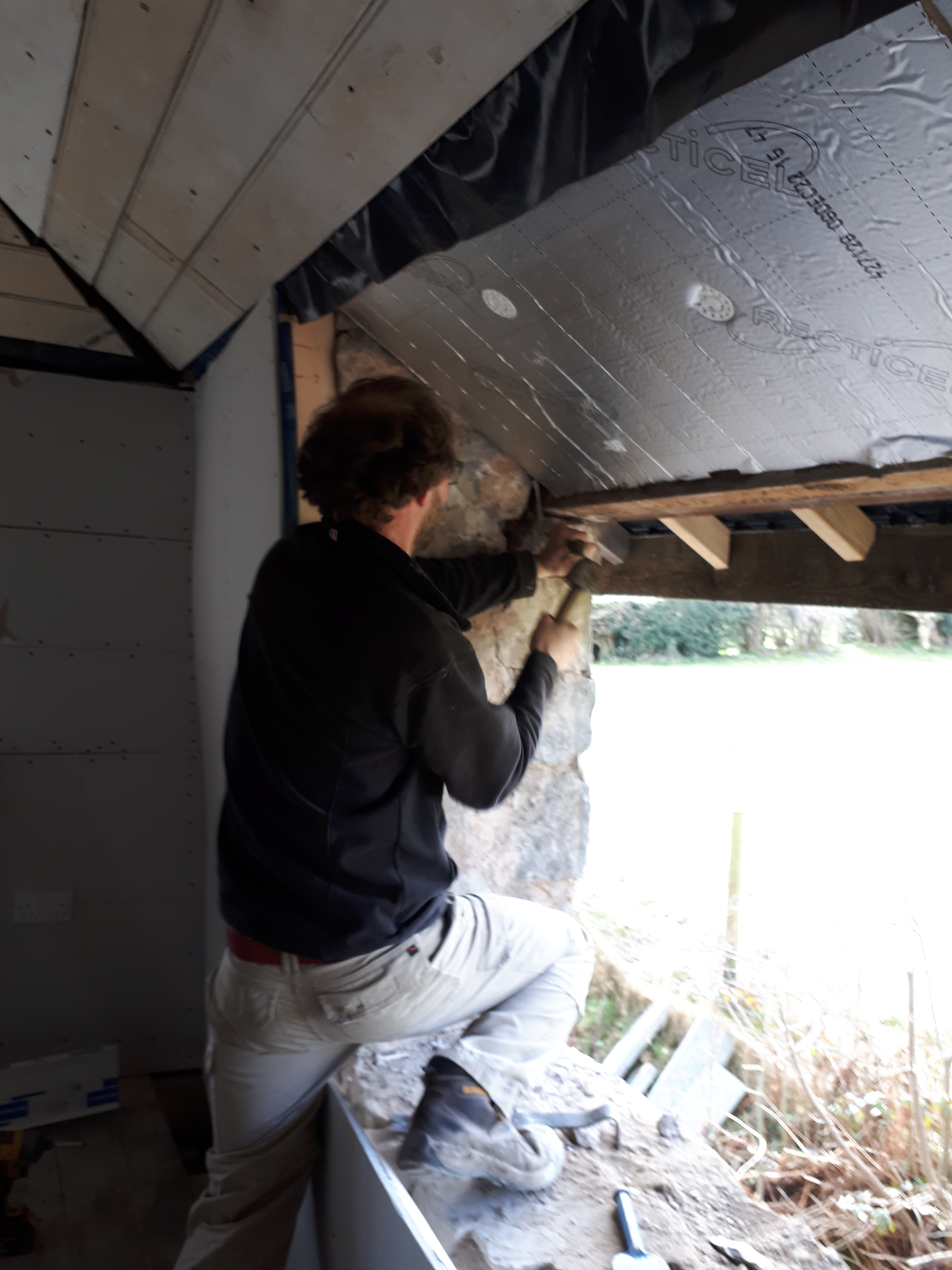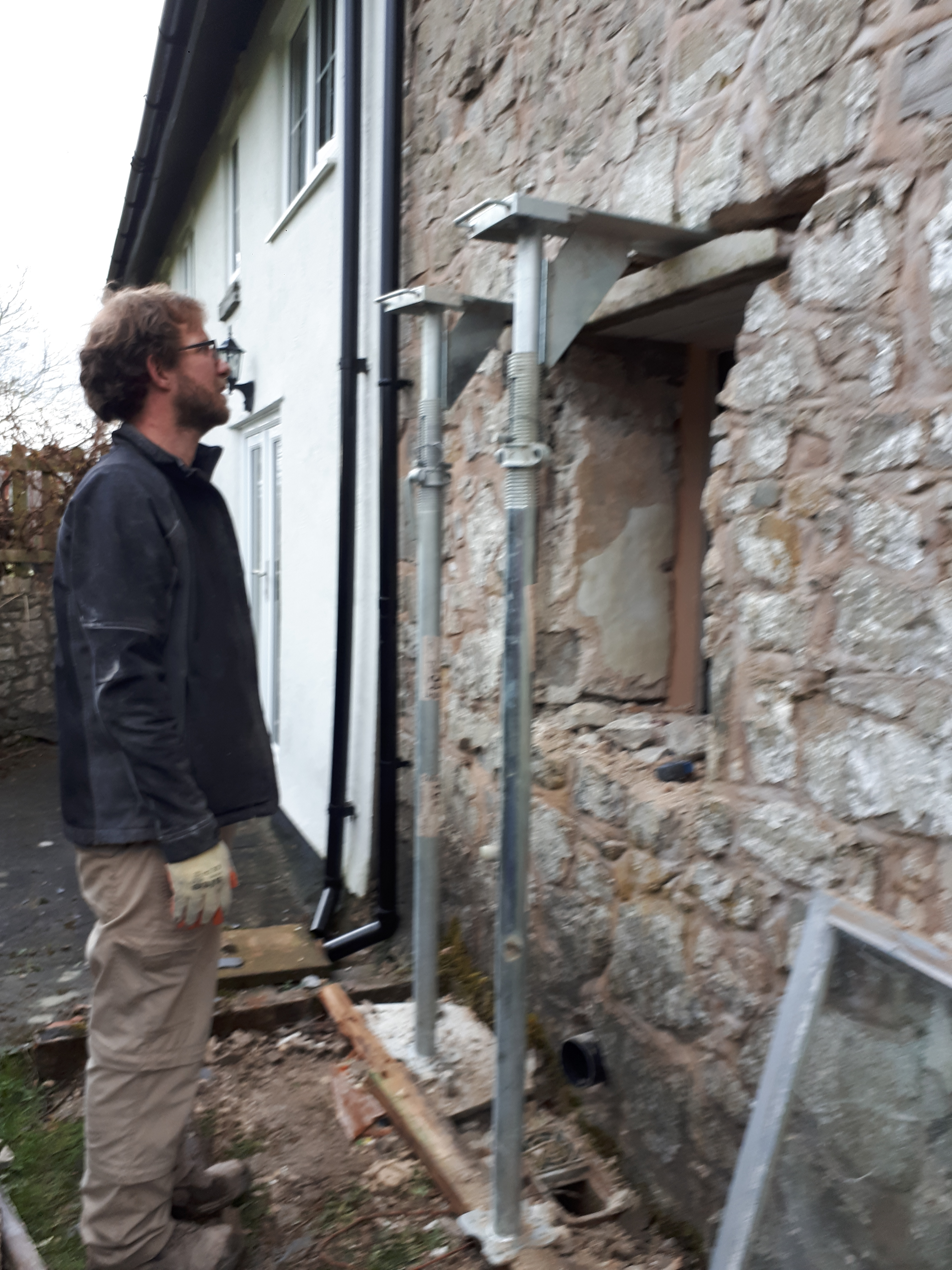 The next window was surprisingly difficult. Taking out the old window didn’t take long, as it was so rotten it fell apart in my hands. Although Chris had previous installed a new lintle on the interior of the wall, as well as in the center of the wall, we needed to replace the outer wooden lintle too. Getting acro props in place Chris started to notice the stones above slipping and had to further support them. Either side of the window, much of the stone the new lintle would sit on had dropped out, the mortar too old and weathered to hold together. It took some time to rebuild everything enough for the window to be put in place, and even then drilling into the rock risked dislodging everything. Finally, in the wind and the rain the window was secured.