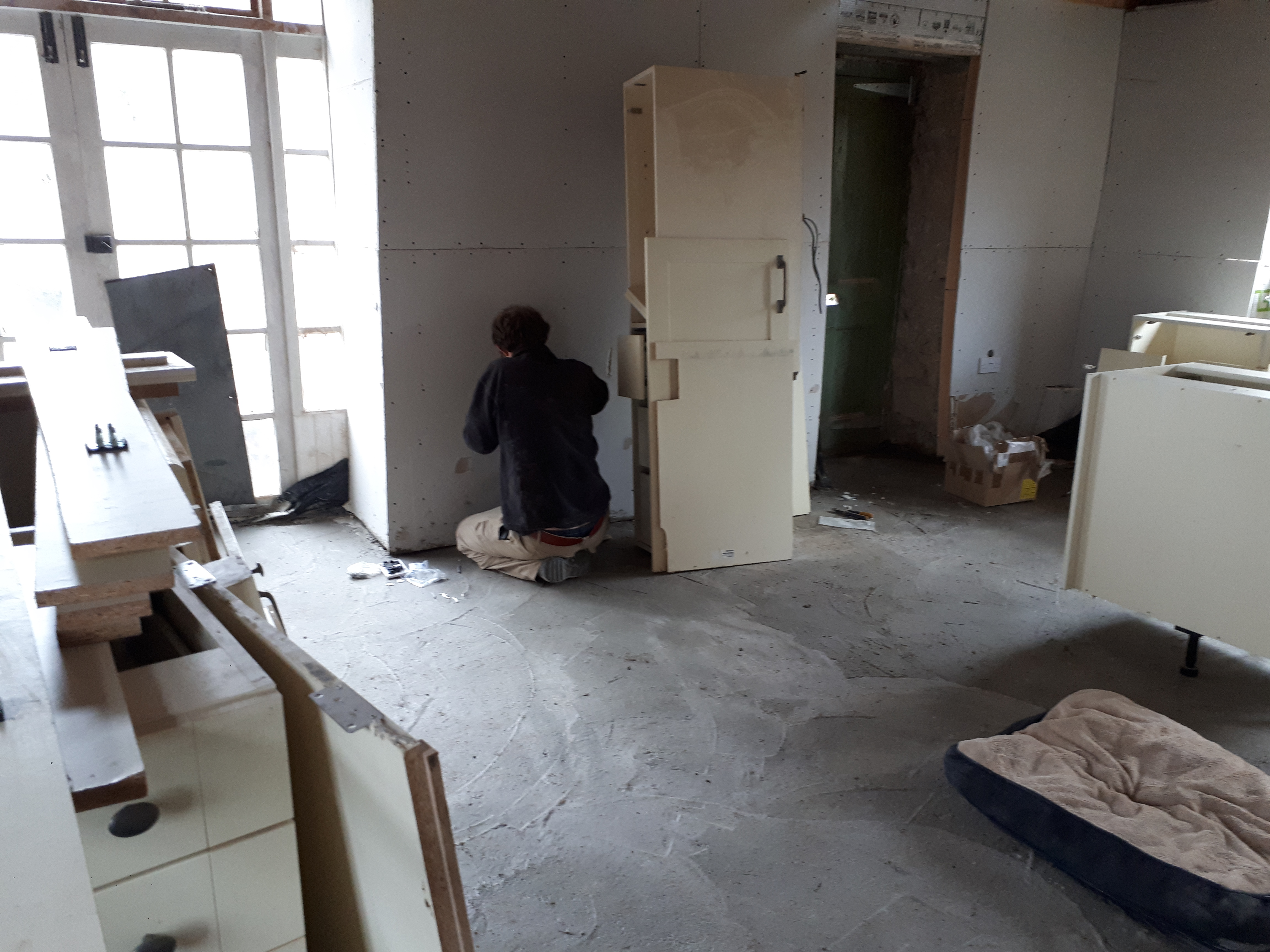 Although it will have to be moved again to polish the concrete, we decided to set up the kitchen units, to check we had everything we needed and work out the best arrangement. After much juggling around, we think we’ve landed on the final design, with several units spare to use in the utility room.