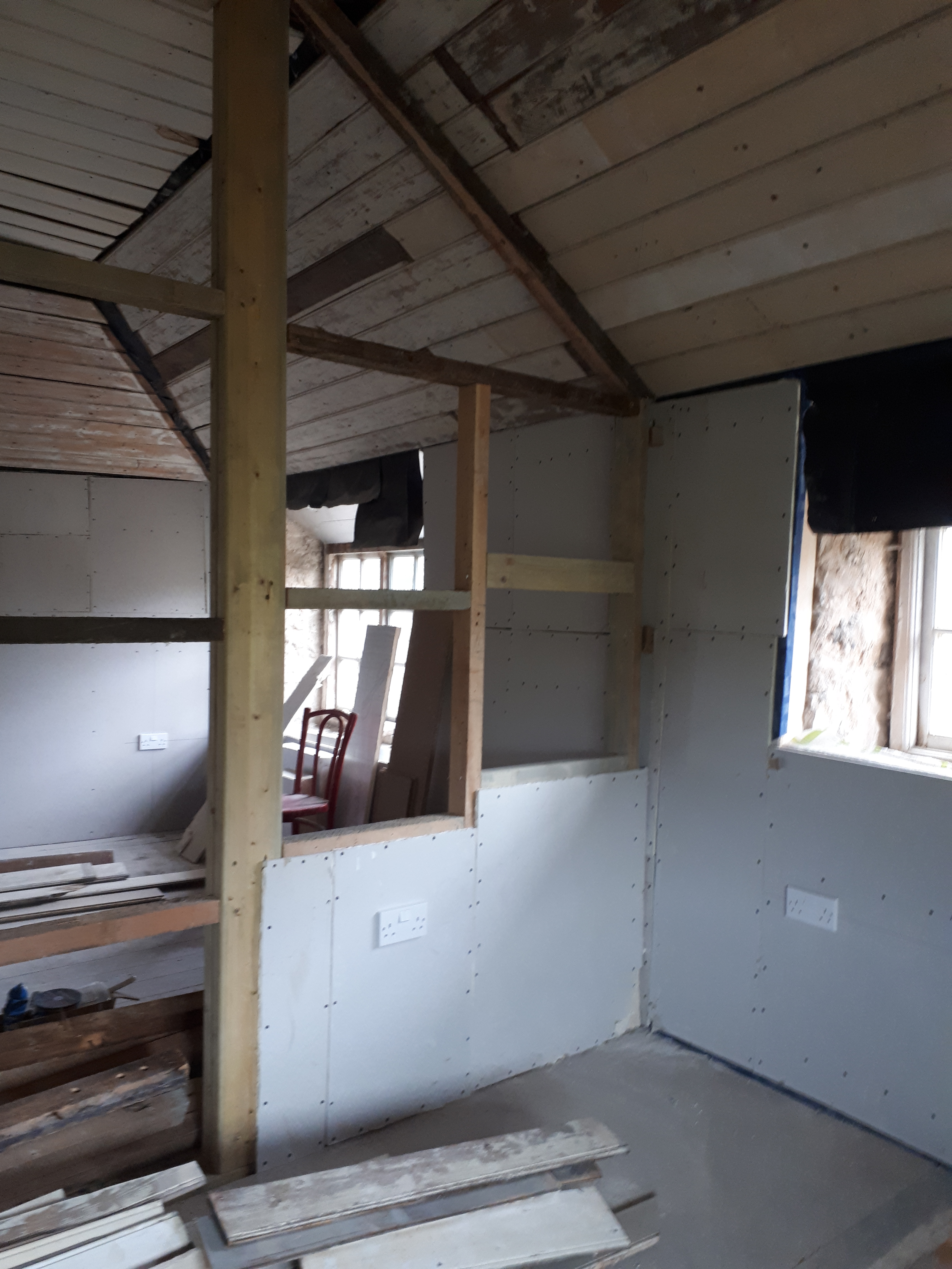 Chris continued his work building the stud wall with reclaimed wood, including installing a new socket. He then carried on his electric work in the kitchen.