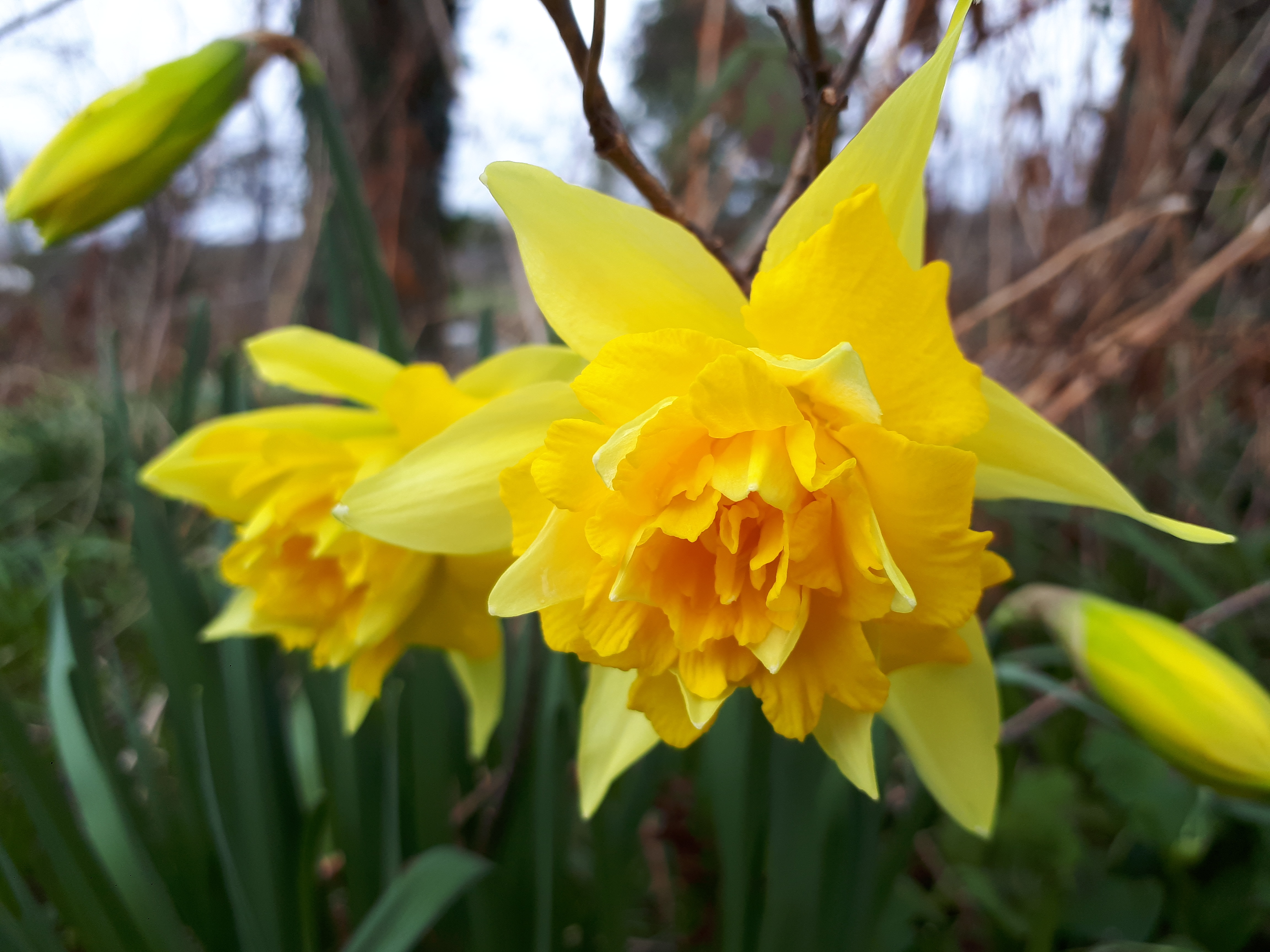 Out in the garden the snowdrops have gone over, but in their place we have a few daffodils to enjoy. I particularly like this bizarre cultivar. No good for pollinators with all its fancy layers, but still very fancy-looking. Hopefully we’ll have a house to match it one day, although a little more wildlife-friendly.