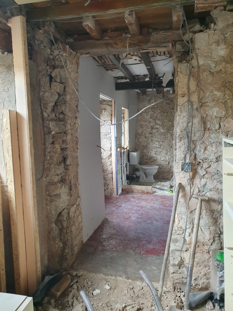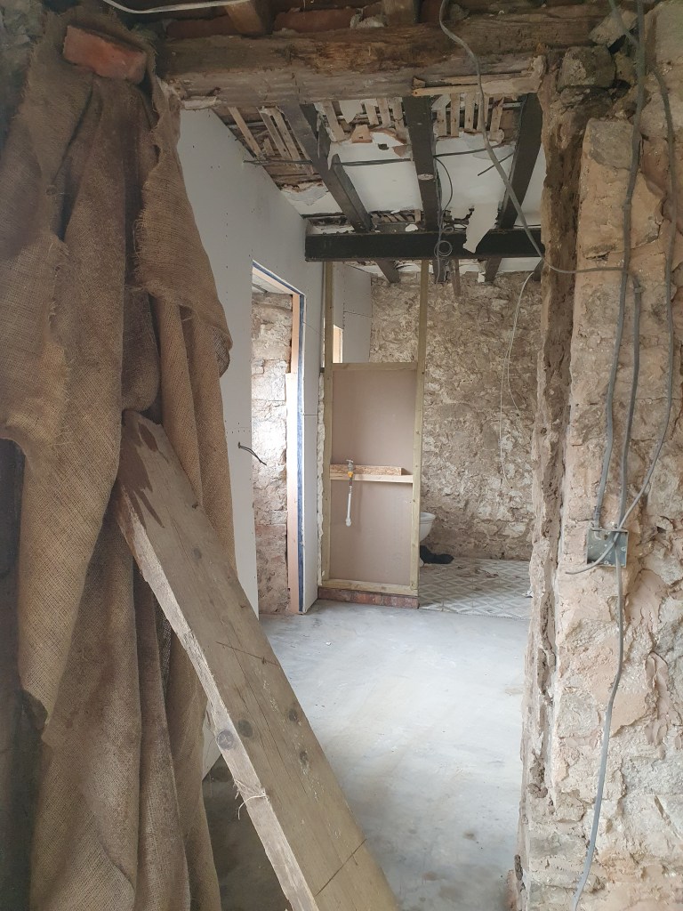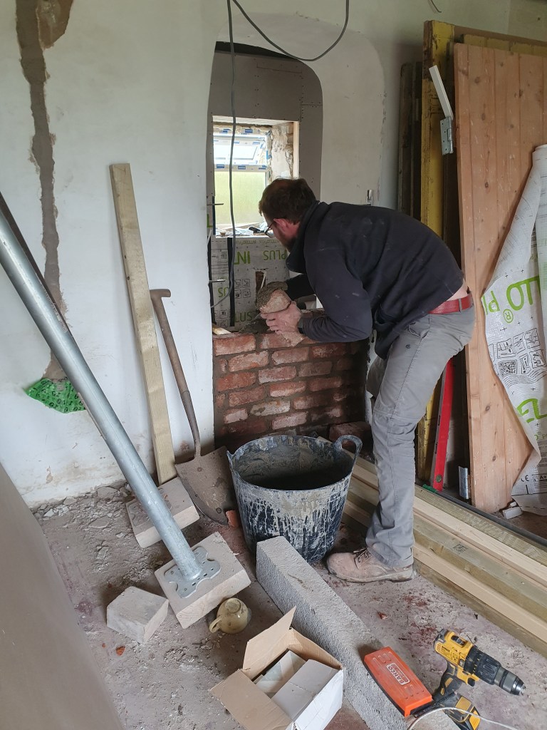 Finally, he rebuilt some of the stonework surrounding the doorway from the kitchen to the utility. Note the health and safety brick, carefully balanced on top of the hessian.