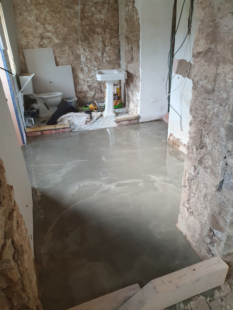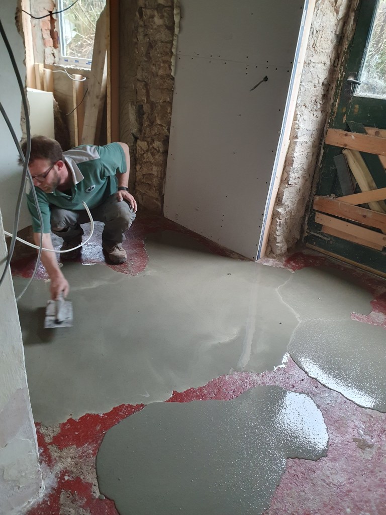 With all the rubbish out the way, Chris mixed the self-leveller and spread it on the floor. We’d hope to lay the tiles before the installation, but haven’t had time. This means the machinery will sit directly on the floor, but as it will probably sit within a cupboard it’s not the end of the world.