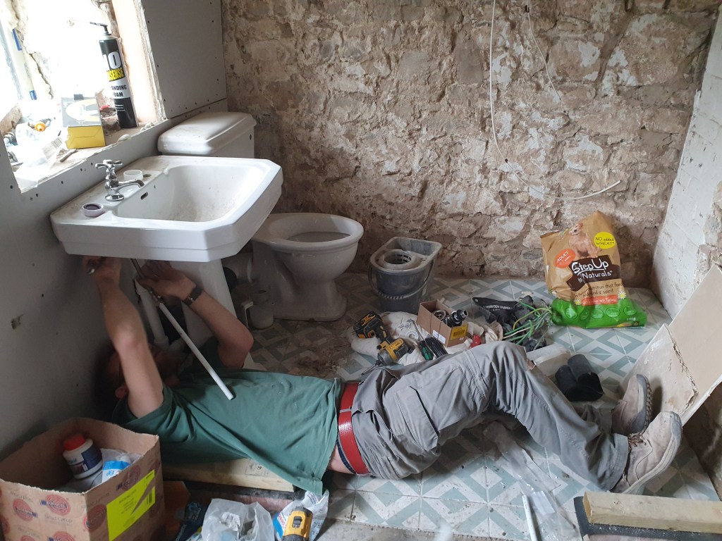 While waiting for the mortar to dry on the first level, Chris started on connecting up the downstairs sink.