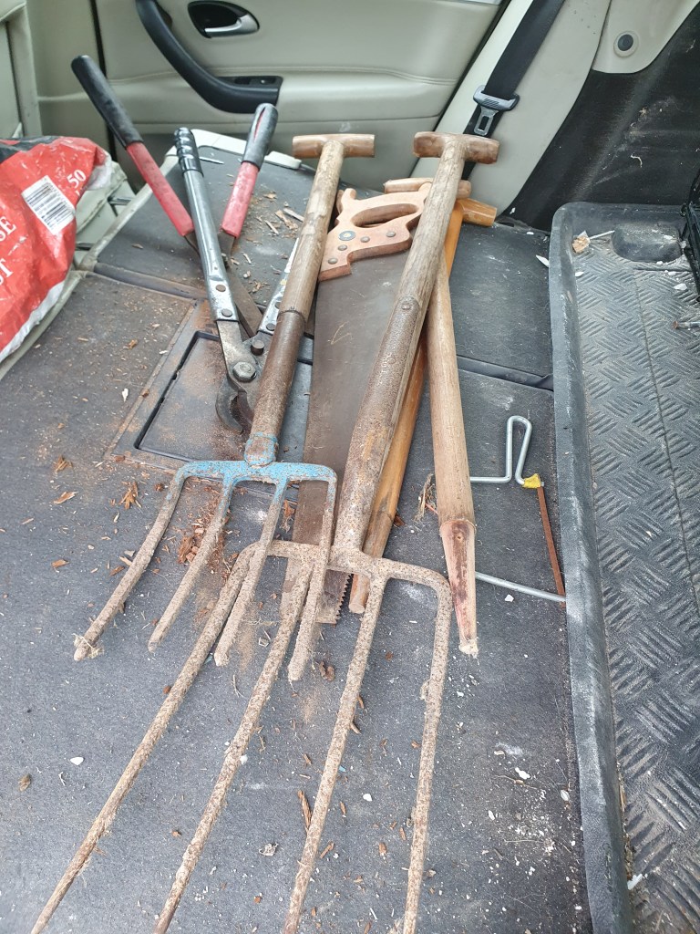 Meanwhile, myself and Tom tidied the house, ready for the contractors, and loaded the car with rubbish to take to the recycling center. Unusually, I came back from the recycling center with someone else’s ‘rubbish’. As we were leaving I saw a man about to chuck away a stack of gardening tools. As they seemed in good shape I asked if I could have them for the community garden. I find it hard to see anything not broken thrown away, and nearly took a set of badminton rackets off him as well, purely so I could rehome them, but I was worried it would start to look like a robbery.