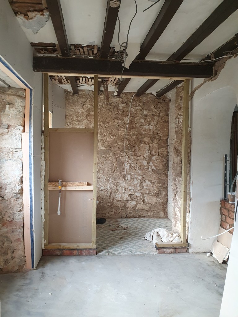 Downstairs, Chris prepared the utility room for the installation of the air source heat pump. He’d already removed the old cupboard and work surface, the last remenants of the old kitchen. Next he took apart the two old doorways that sat between the kitchen and utility. We’d always intended to remove one but we had to remove the second as it was damaged and needed replacing.