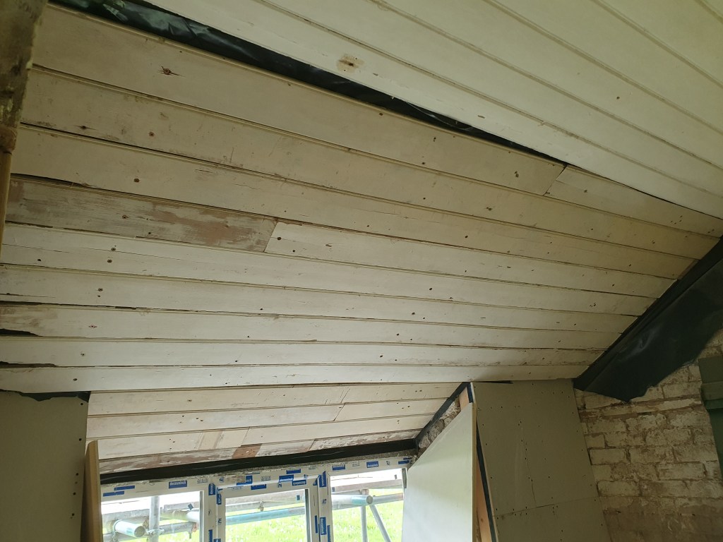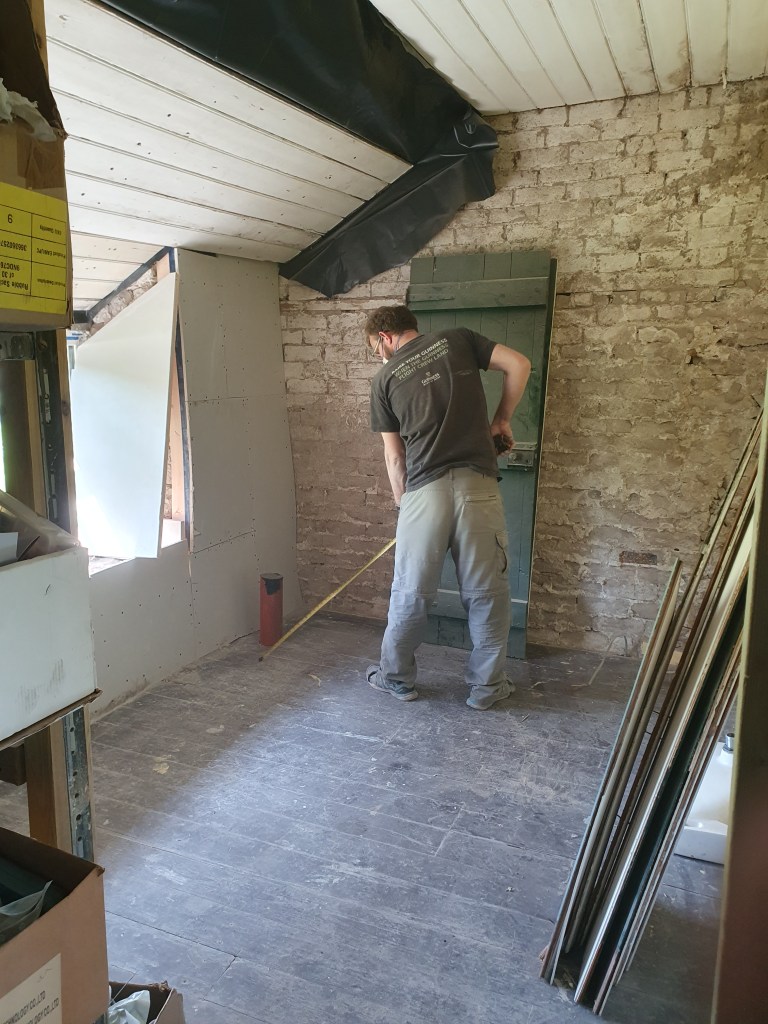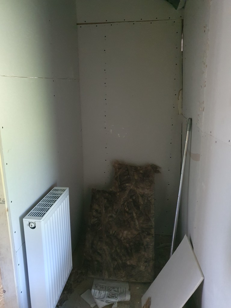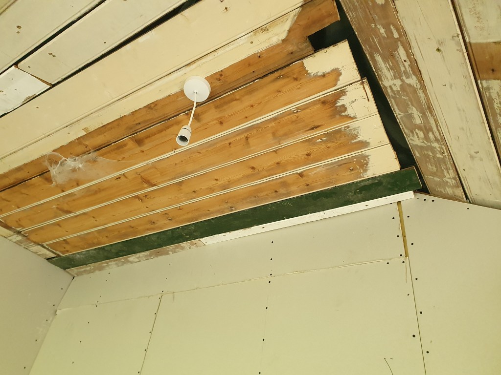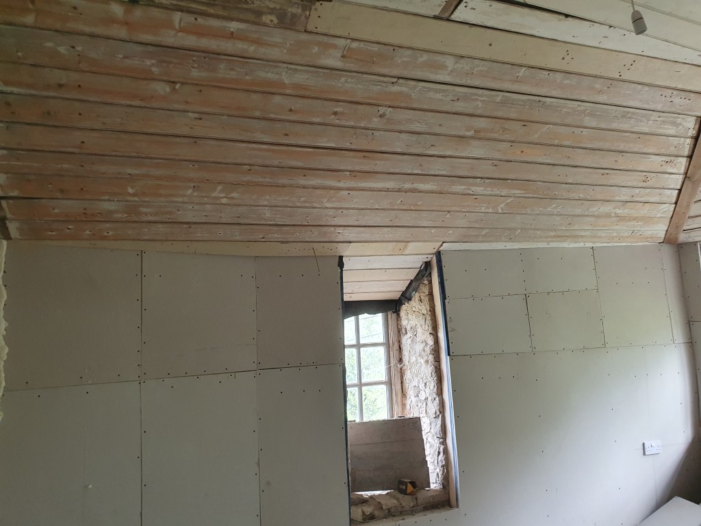 While having the contractors is amazing, every now and then they do things that make absolutely no sense. This week they pull down all the plastic sheeting from the ceiling of the shower room, which is a painfully annoying job to do. They appear to have done it in order to get their plasterboard on, but the sheeting should be behind the plasterboard…