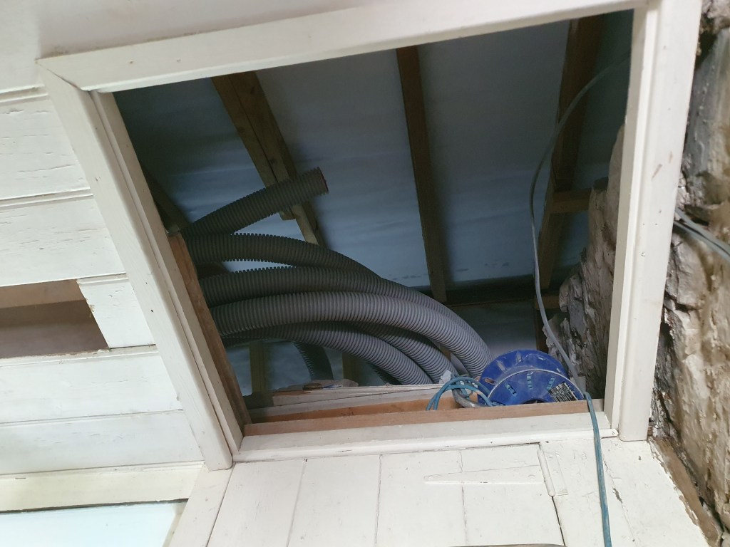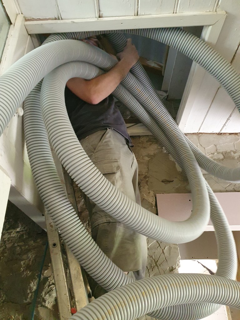 Our bathroom has long been filled with over 100m of ventilation ducting. In order to make some space we decided to move it into the attic, where it would be fed down from eventually. Moving the spagetti monster wasn’t as easy as it at first seemed. Even with me pushing up from below, and Chris gathering in from above, it still looked like an alien had invaded our attic.