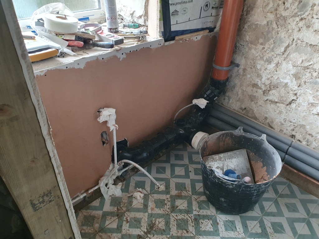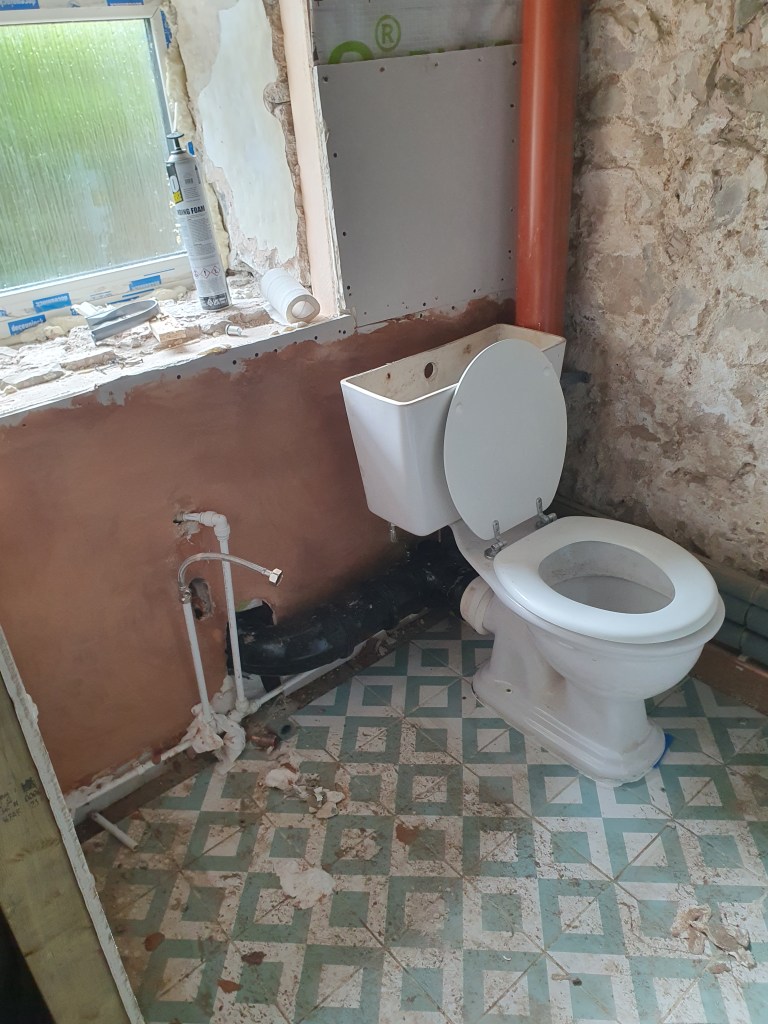 The contractors are supposed to be plastering the external walls soon, but Chris plastered the small area behind the downstair’s toilet, so it could be installed. It’s great to have a flushing toilet once again. With the tiles already down this room already looks the most complete.