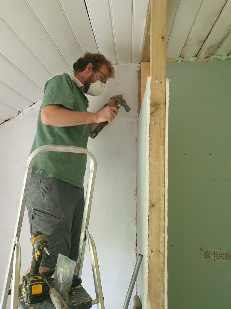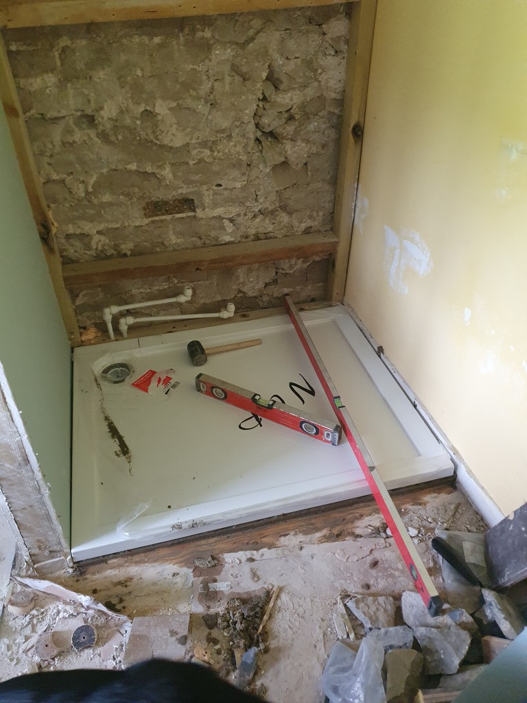 Chris is desperate to get the shower finished, so he concentrated and moving that along. Getting the shower tray in was a faff, because of the thick stone wall beneath it. He then got the pipework in place and attached the plasterboard.