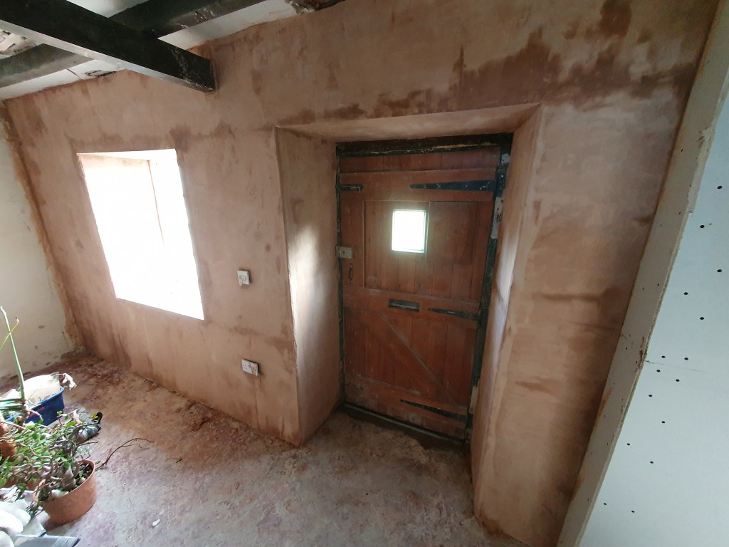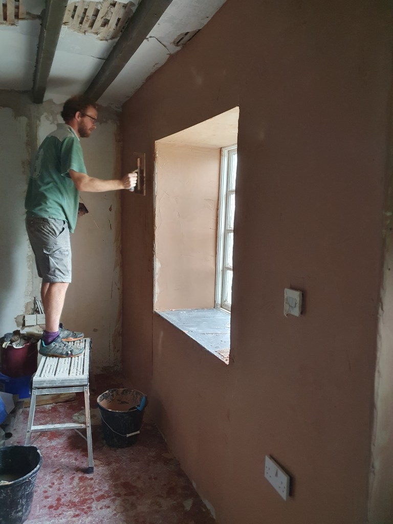 Meanwhile Chris busied himself plastering the lounge wall. Originally we’d planned to finish the upstairs first, but Chris pointed out that a large amount of the stuff taking up room is destined for the lounge, so with that room complete we can make more space to work elsewhere.