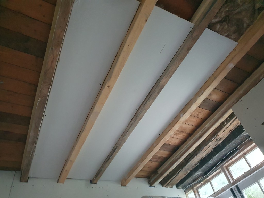 On Sunday I set to work putting up insulation and plasterboard on the dining room ceiling. It’s always exhausting working above your head, and ideally I needed about six pairs of hands, but still most of the room got finished. The last few bits need the stack of boxes gone to be reached, and then we’ll start on the kitchen side.
