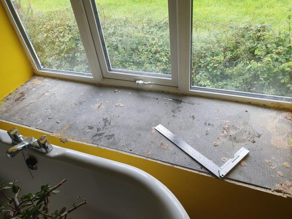 I set to work tiling the windowsill. It was surprisingly difficult as the base put in by the contractors was nowhere near flat, and larger tiles are aways more tricky. Finally having finished, Chris in his usual complimentary style stated that it wouldn’t be particularly obvious once there were things on top of it.