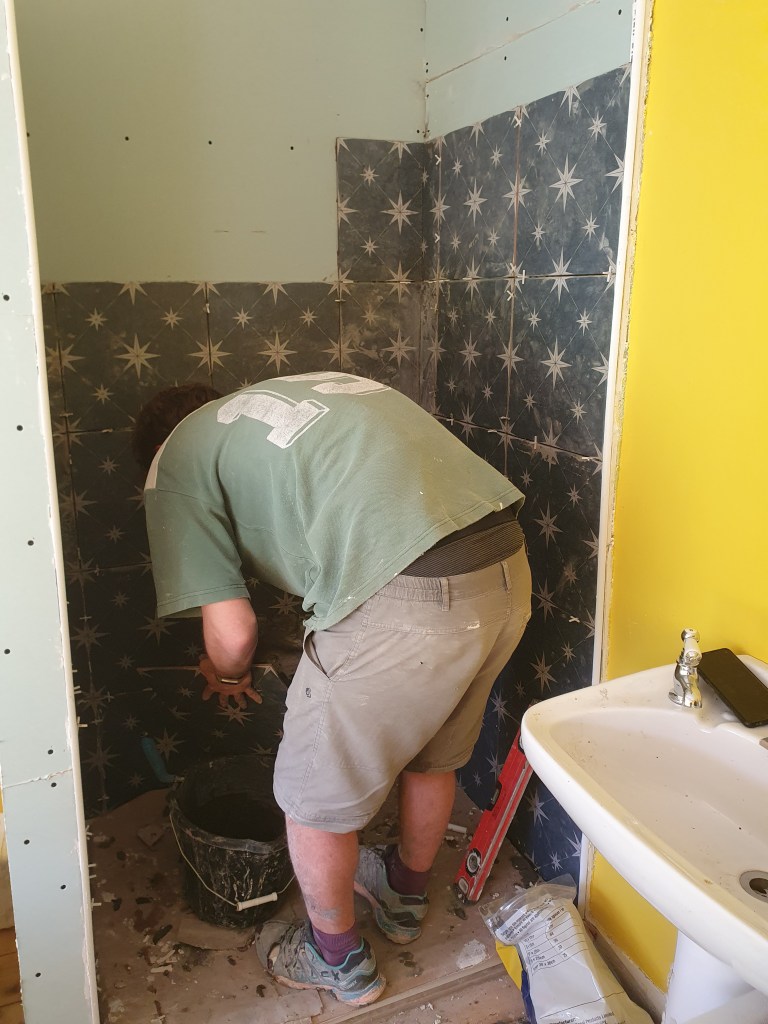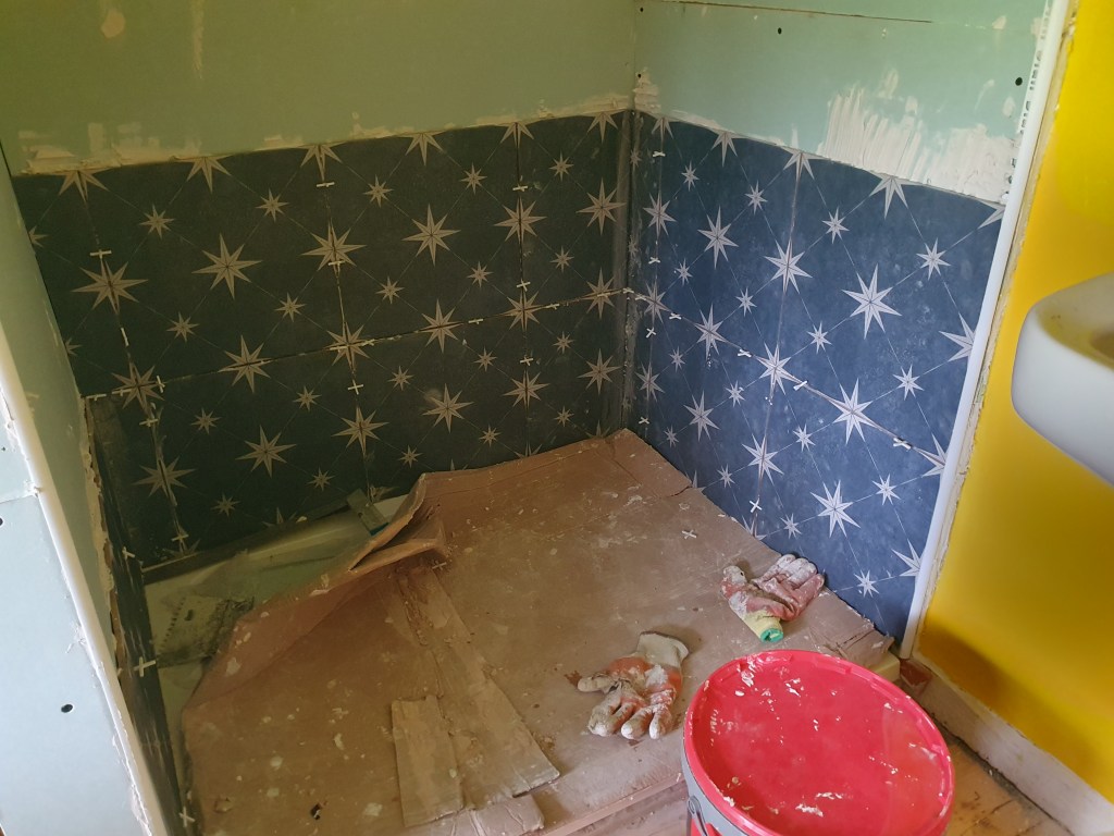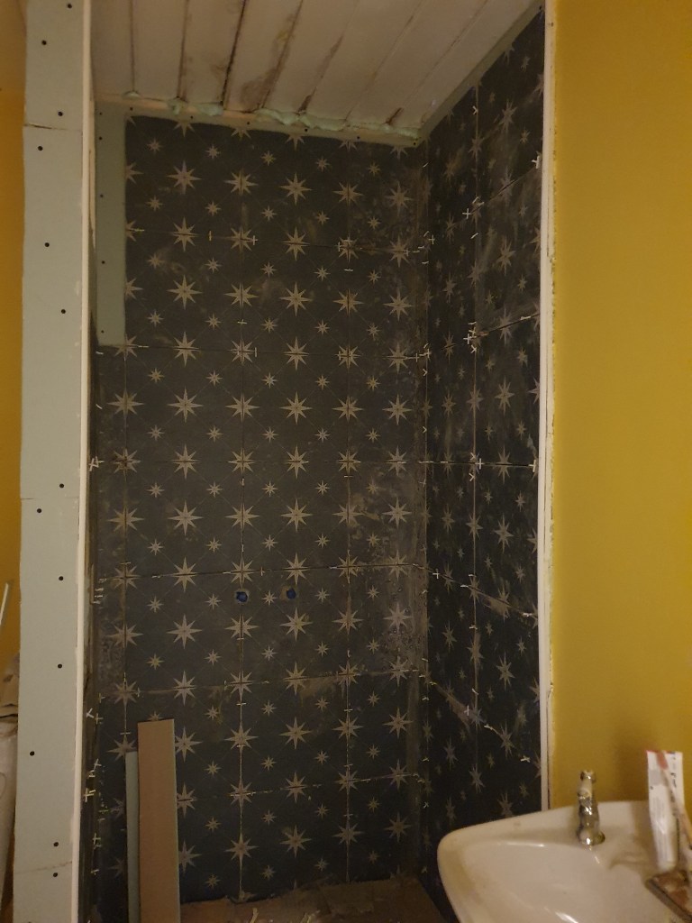 Next I started on the shower, which was much easier given the plasterboard was fairly flat. Having reached the shower pipework I handed over to Chris, as I wasn’t sure how to drill through the tiles to get the pipes through. I like the blue tiles with their starry pattern, however I can’t help be reminded of a magician’s trick box, like we might walk in and then reappear in another part of the room.