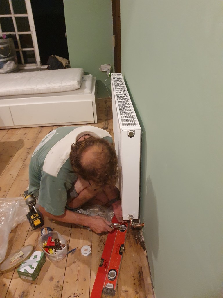 As there’s no space in the other bedrooms at the moment we condensed our pull-out bed into a single, and pushed it against the window, setting up our old double in the middle of the room. As a final effort to make the room a little more accommodating Chris attached the radiator back onto the wall, after its long holiday on the floor. It’s the little touches that give us our 5 star rating.