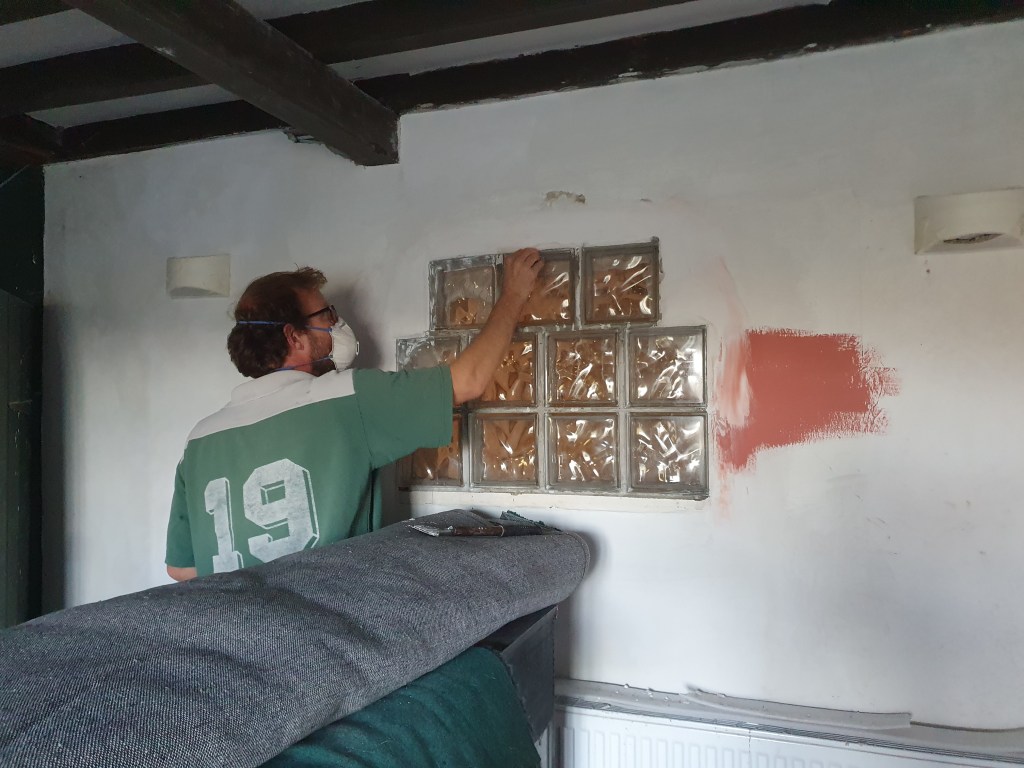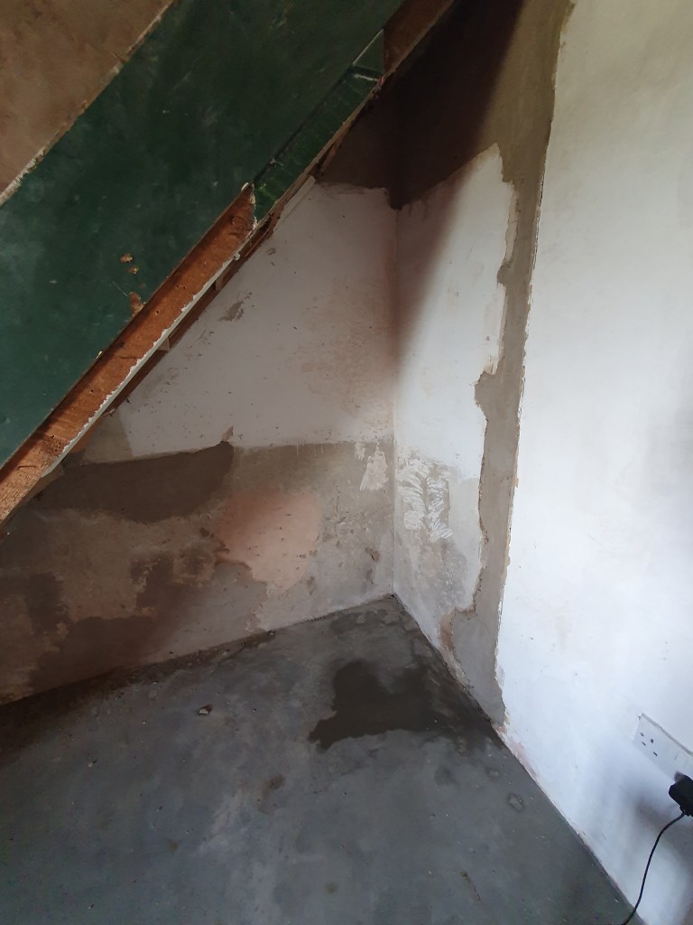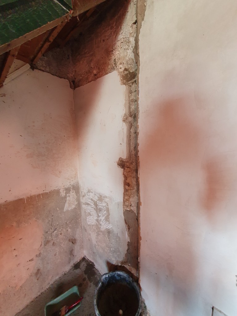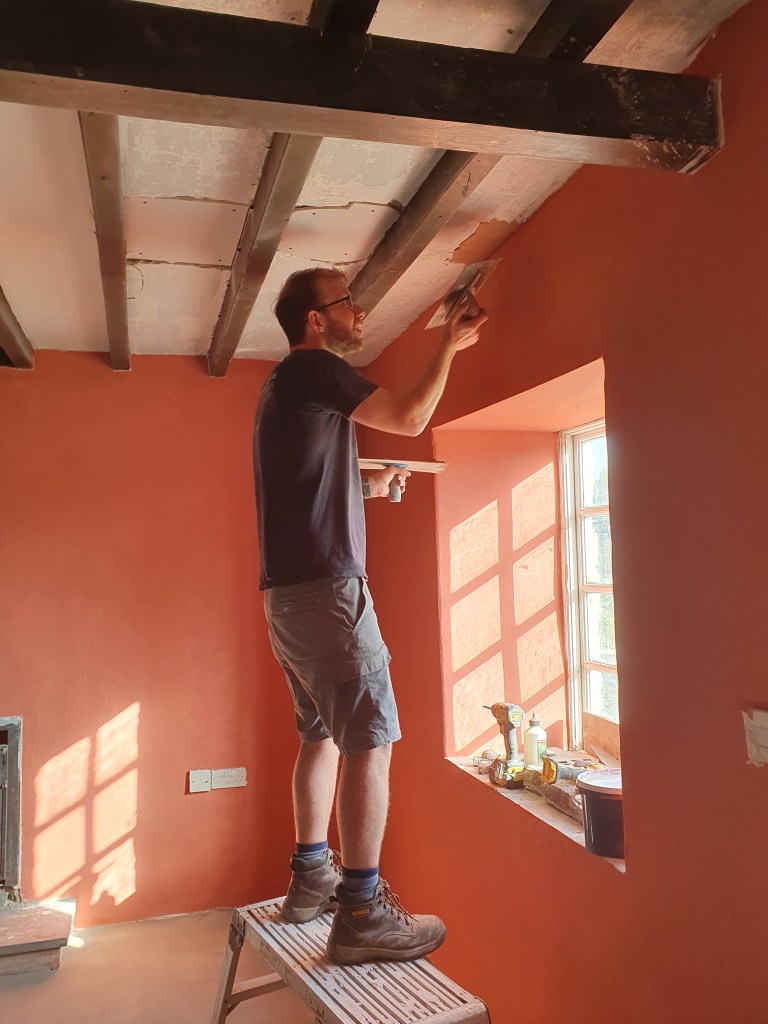 Next came the filling, with Chris plastering the holes in the ceiling, while I tackled the holes in the walls.