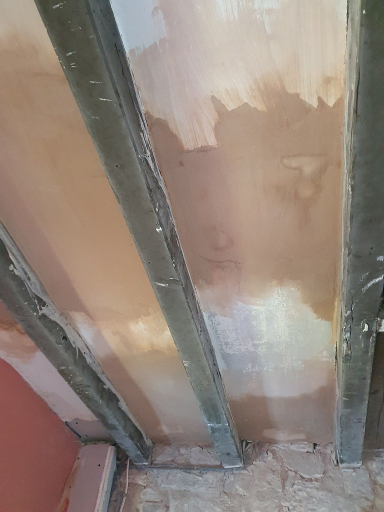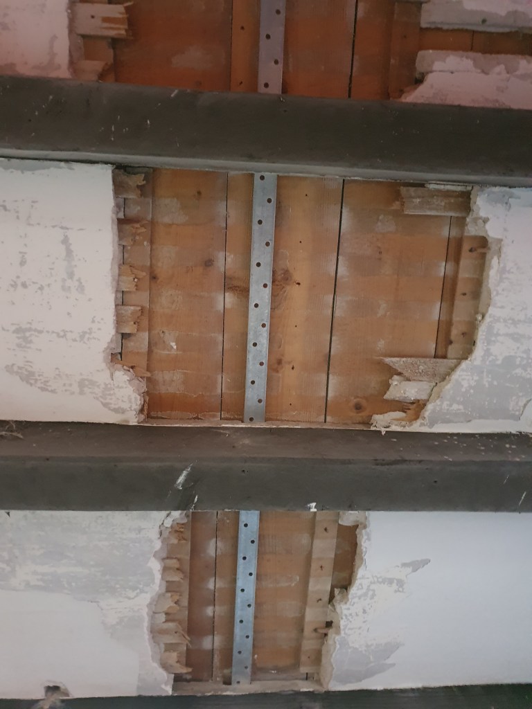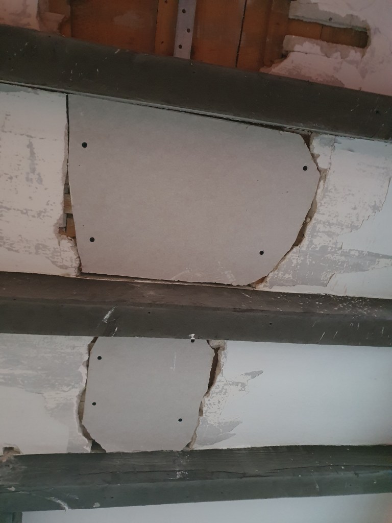 I started by filling the holes in the ceiling, leftover from installing the steel straps. We’d been putting off the repairs for ages as we weren’t sure how best to go about replacing the plaster and lath. In the end we decided just to screw plasterboard to the ceiling and plaster over, we may well find that was a mistake.