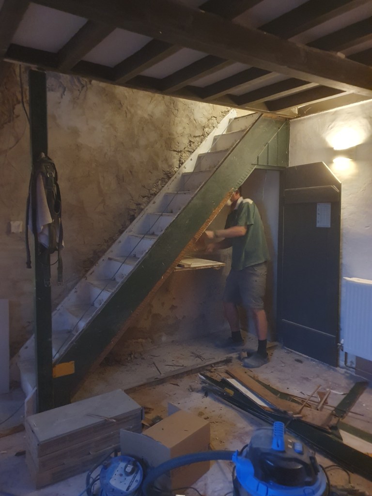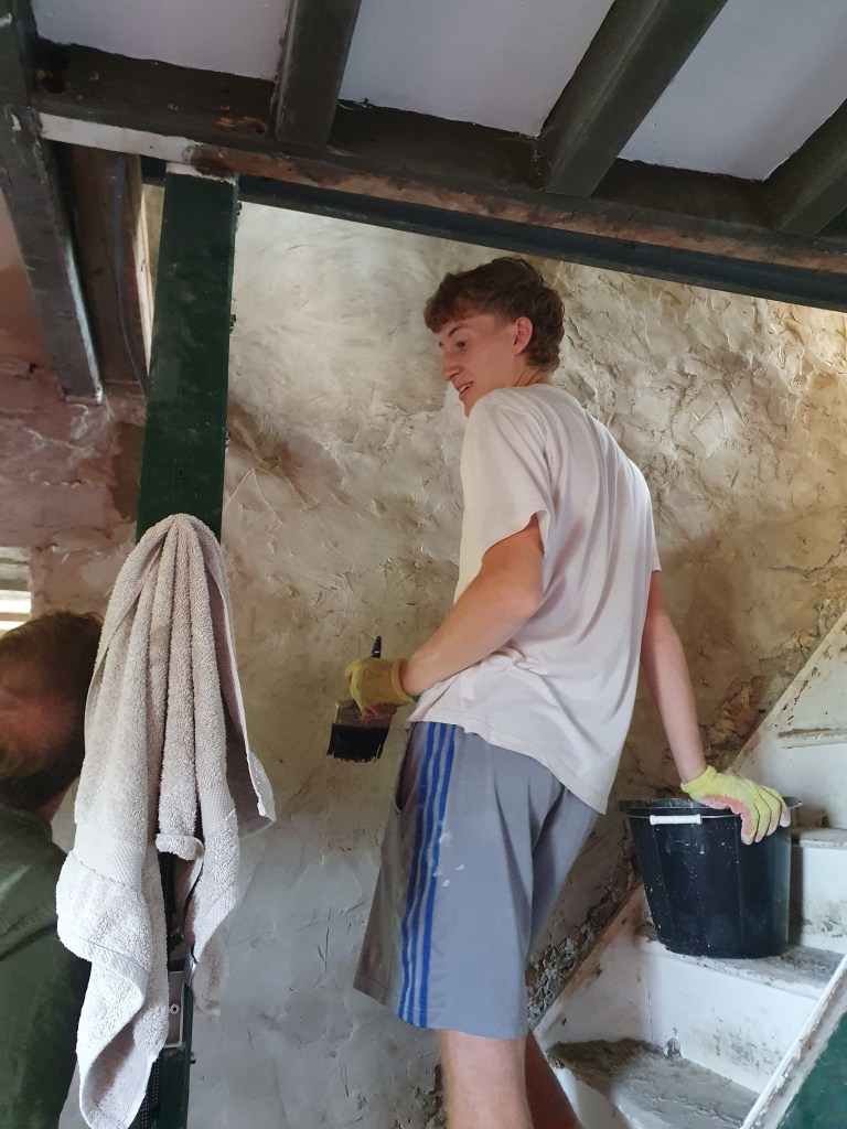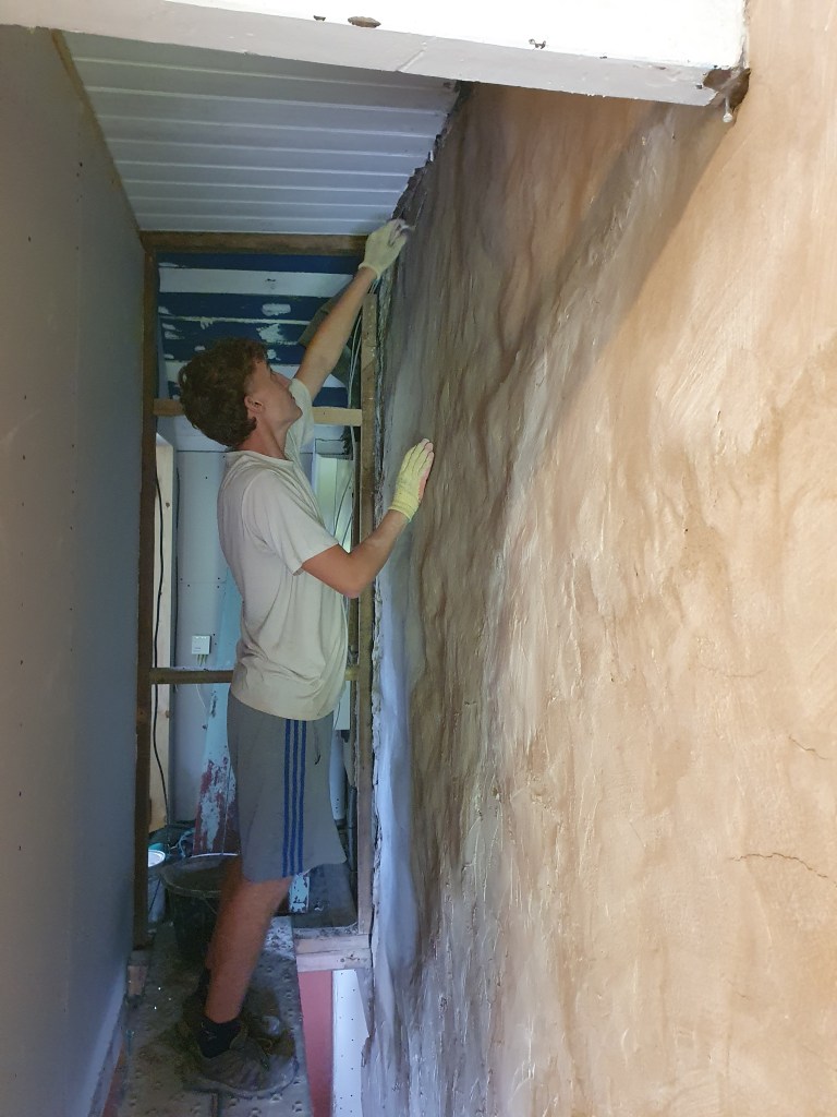 Chris’s cousin Jude was looking for some work over his summer holidays and offered to come do a few days for us while he was free. He did his first day’s labouring and finished off plastering the tall stairway wall, which has been a job that’s kept slipping down the to-do list. We’ve decided to leave it with a relatively rough finish, both for a textured look and to avoid driving ourselves mad smoothing it out.