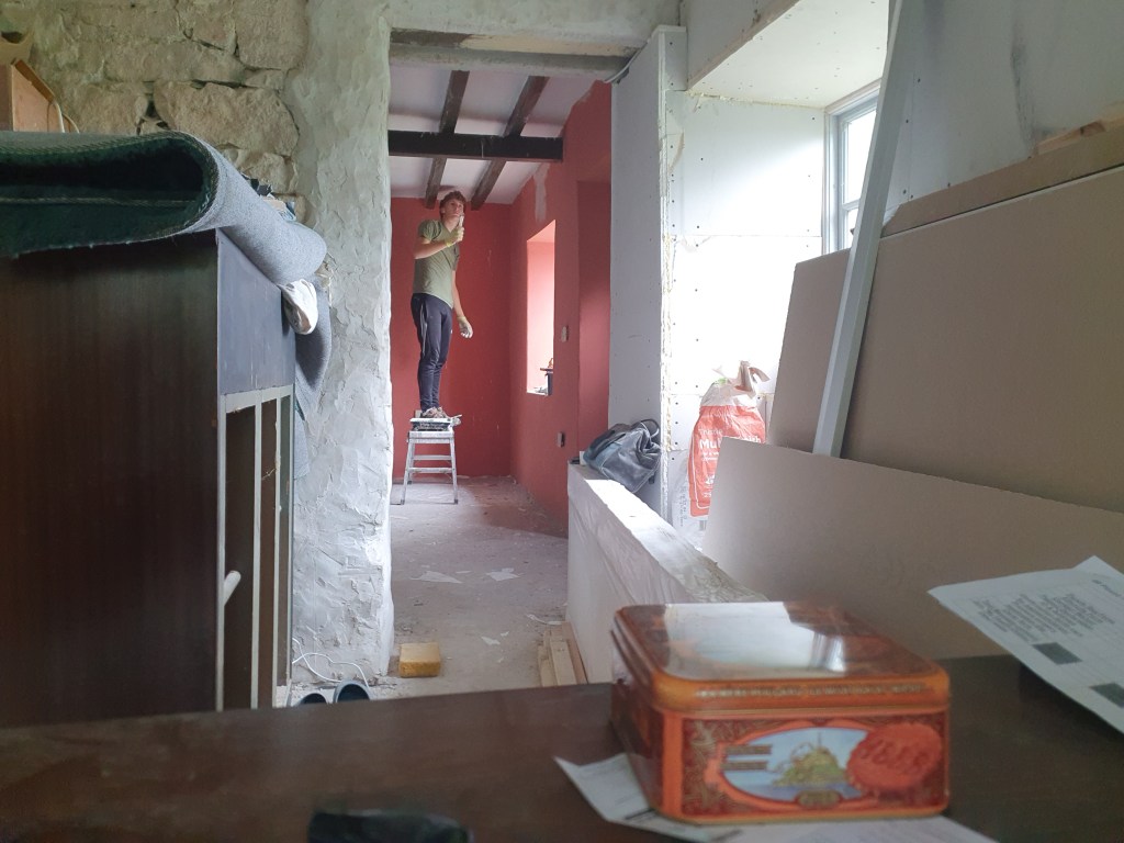 On the bank holiday Monday we focused on the utility room, lugging everything out once more, and preparing the walls for plastering by cutting off the excess expanding foam, curving the corners and applying PVA. It’s amazing how quickly the house descended into chaos once more.