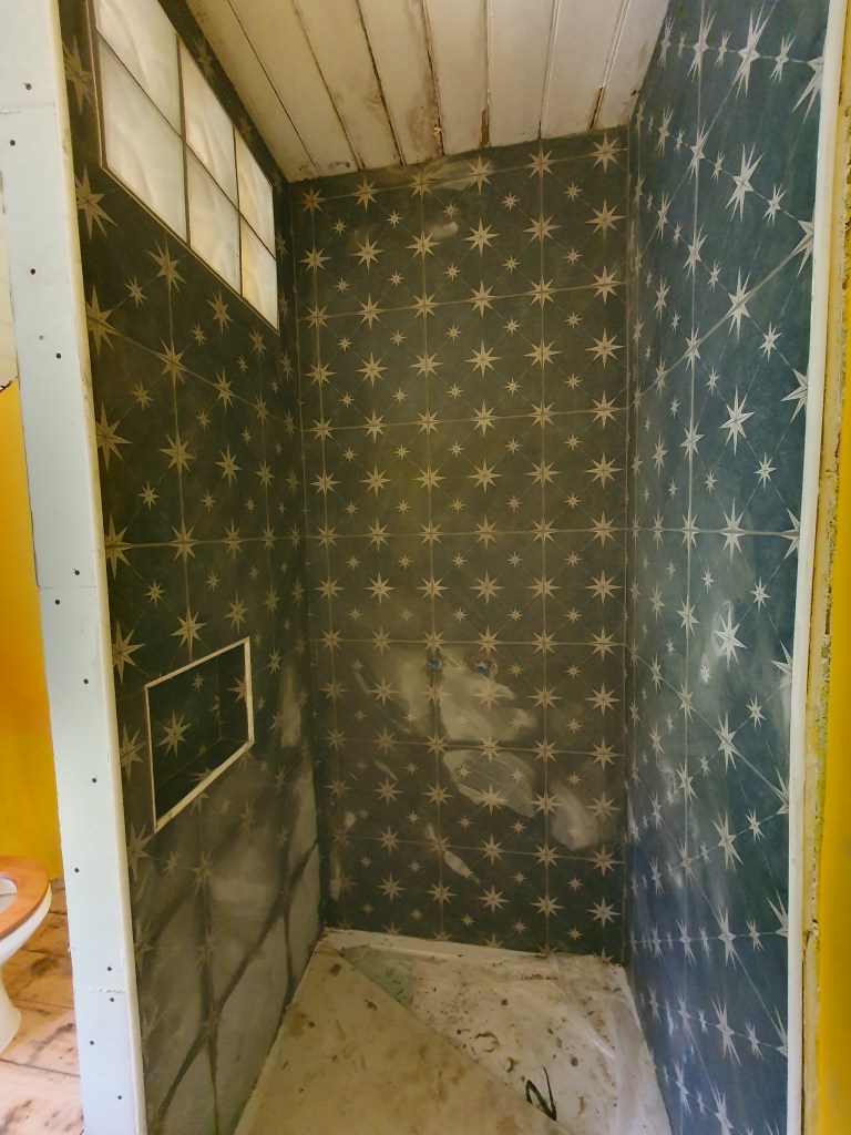 With the tiles all in place, Chris spent some time grouting them. The glass bricks were a bit of a nightmare in the end, but I think they make a big difference to the space, keeping it from feeling dark and unwelcoming.