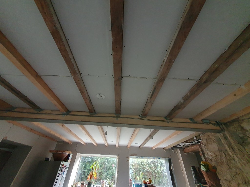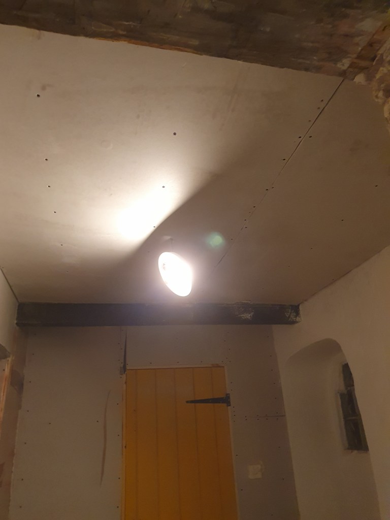 Having moved the boxes of books from the kitchen to the space under the stairs, we were finally able to reach the rest of the kitchen ceiling, so as to finish the plasterboarding.