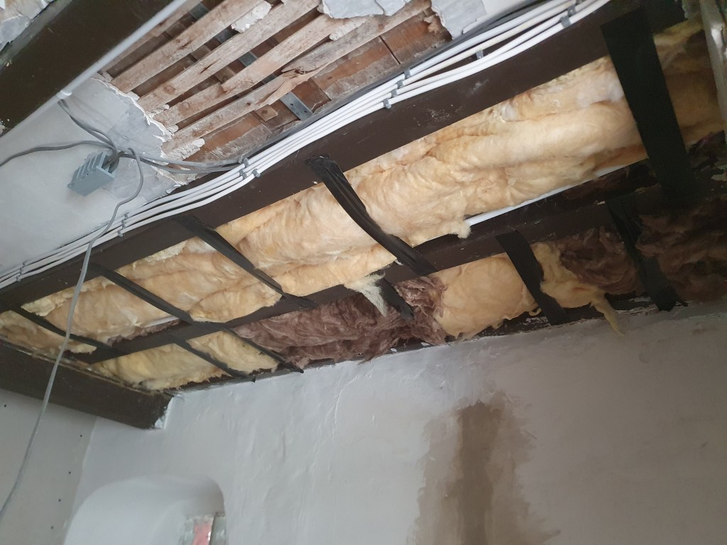 With the machines out of the way we added insulation to the ceiling and attached the plasterboard. We’d decided to sacrifice the beams in this room, so as to make it possible to hide the pipework in the ceiling. As we didn’t need to attach batons to screw the plasterboard to, the insulation kept falling out, meaning we had to resort to gaffer tape to keep it up.