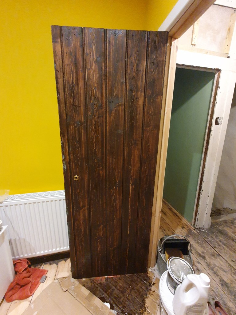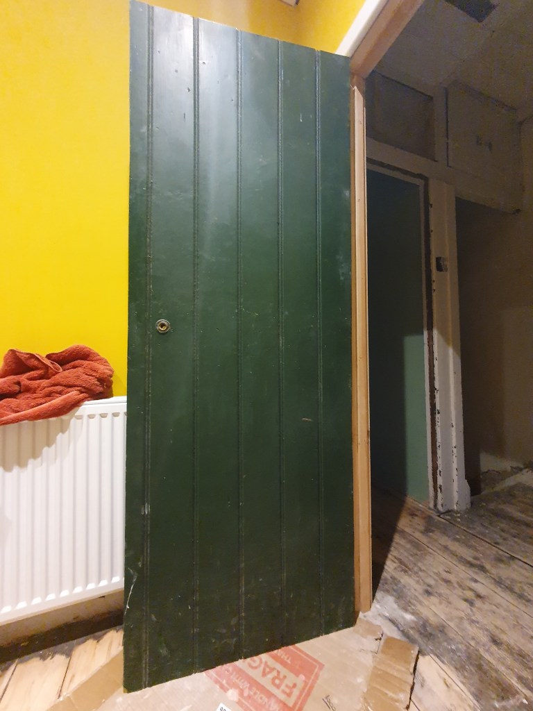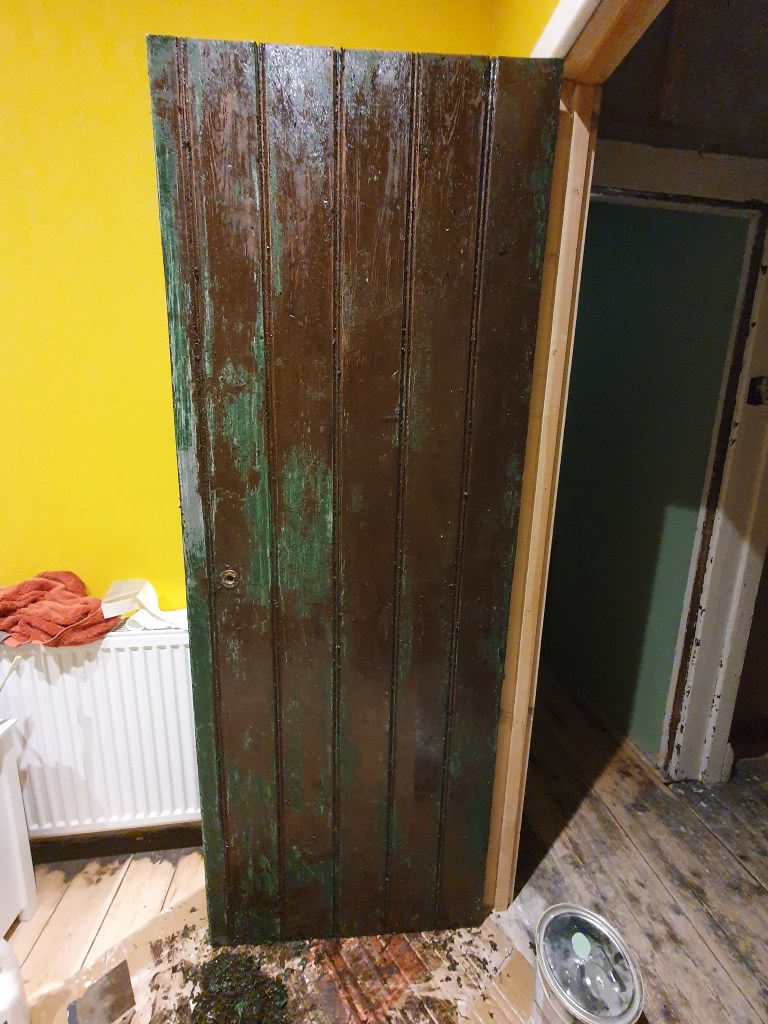 We decided to strip back the landing side of the upstairs doors, which are currently all dark green. The inside we’ll paint white, as the rooms are brightly coloured and a busy door might make everything feel a bit much.