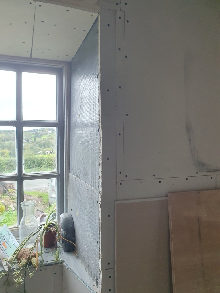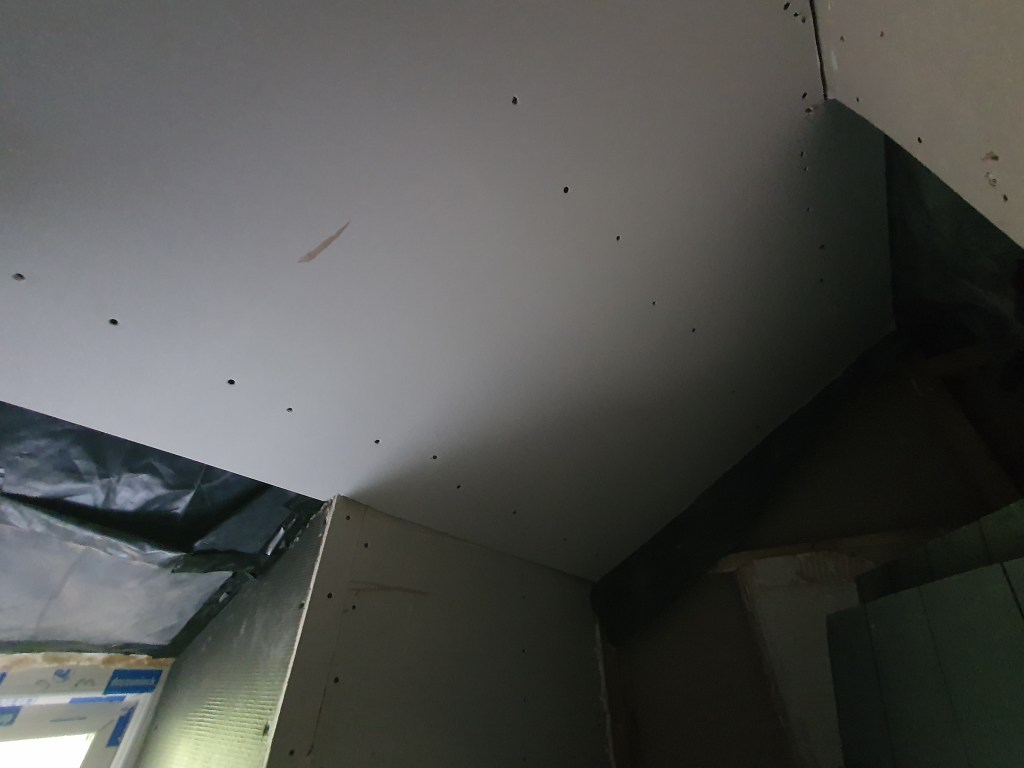The final bit of ceiling plasterboard also went up in the kitchen, meaning we’re now ready for the plasterer to do his thing.
