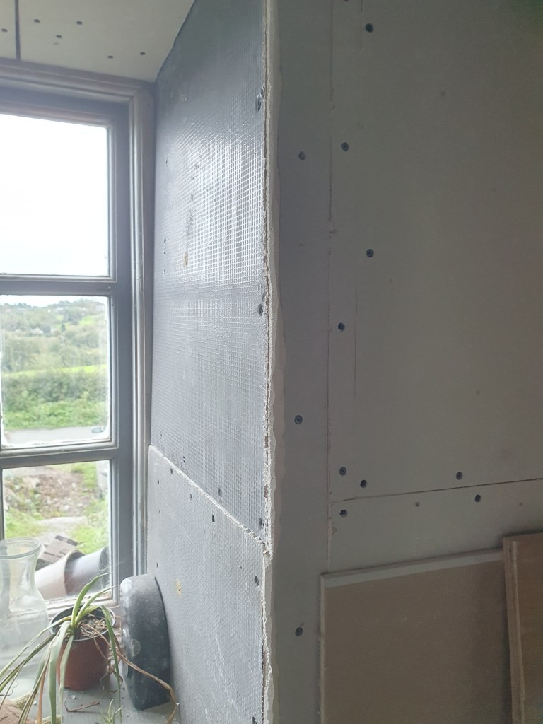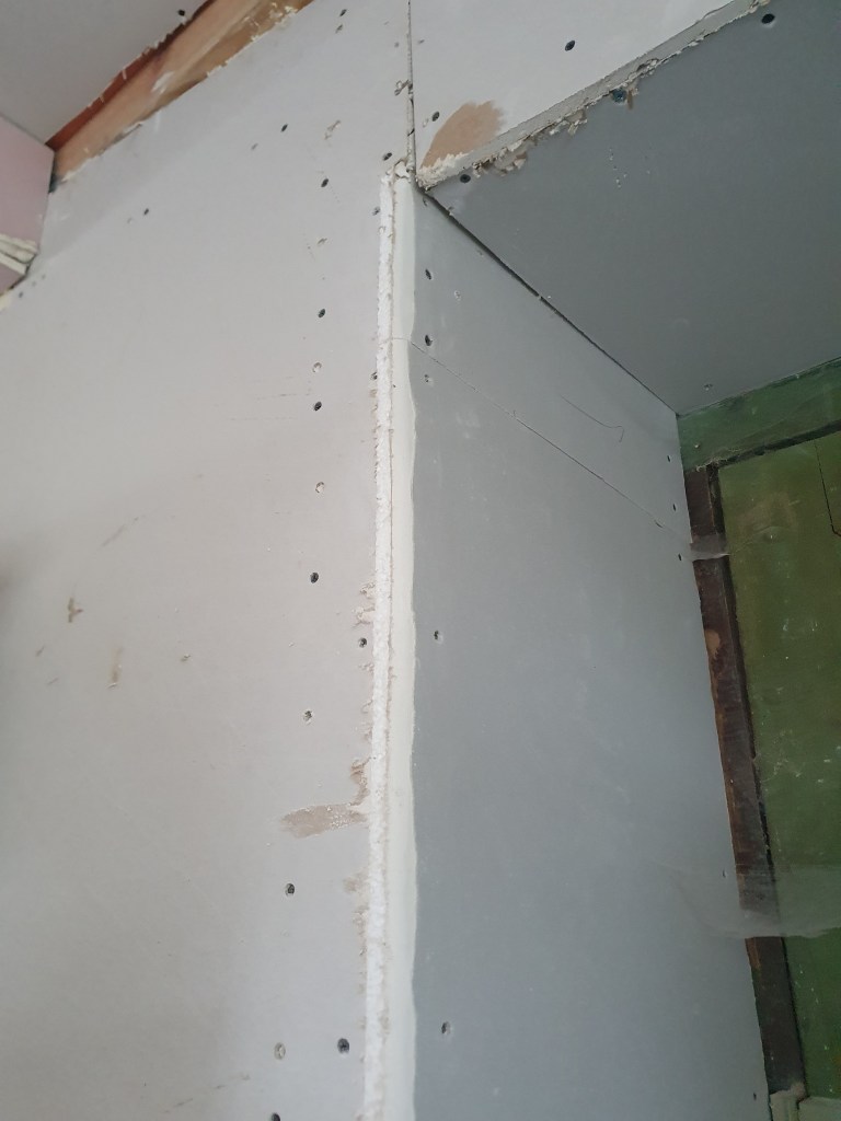 In the kitchen I got to work taking the corners off the plasterboard, so the plasterer can give us nice rounded ends to the walls. It would have been nice to go for even more dramatic curves, but without very fancy plastboarding I don’t know how we could have achieved it.