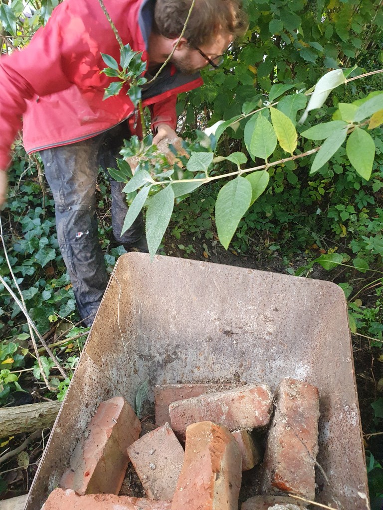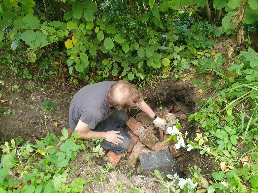 The starting point for us is to fill in the sinkhole, which the water will be piped through. The land has sunken down around the sinkhole significantly more, so Chris decided we should put our remaining uncleaned bricks down it. Though we could have sold them, they likely wouldn’t have been worth much, and it’s more important the sinkhole is stabilised.