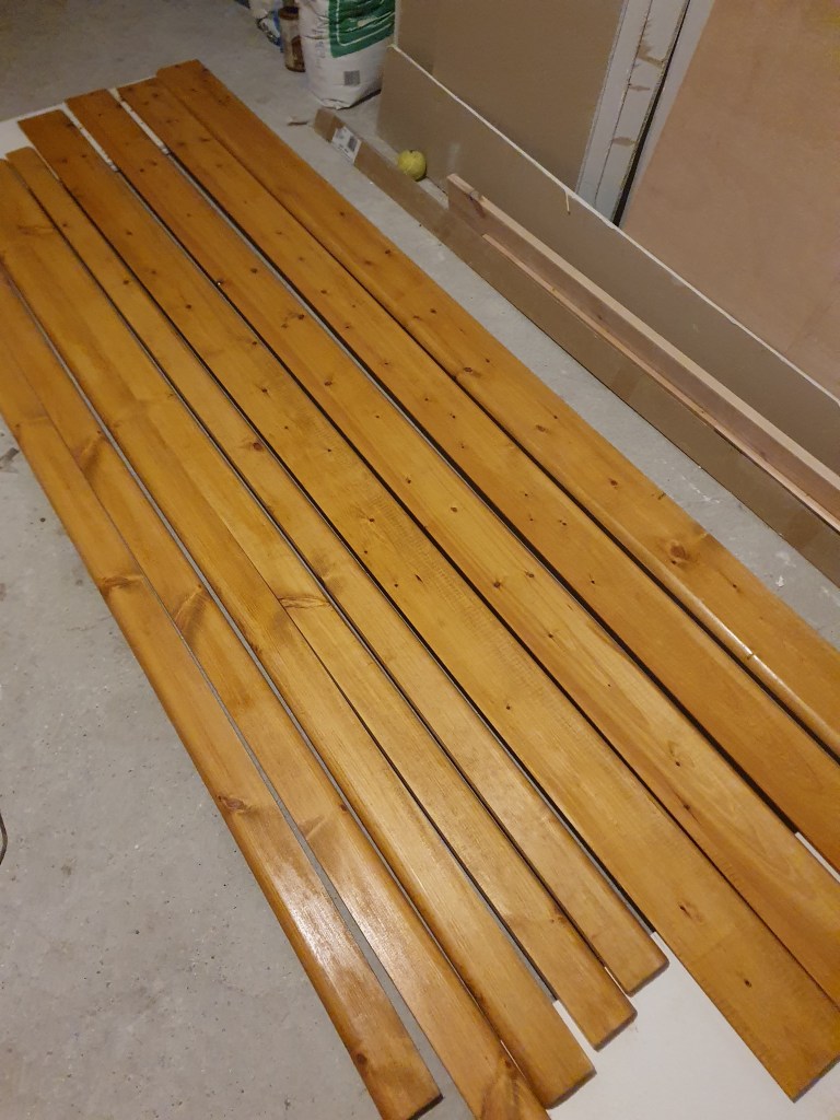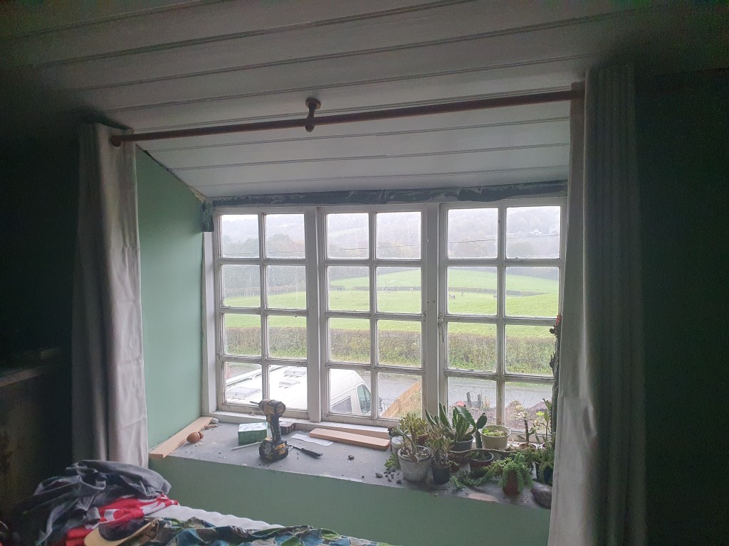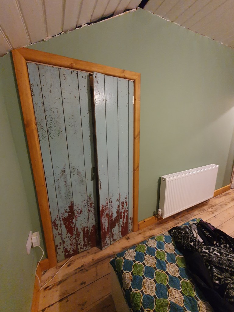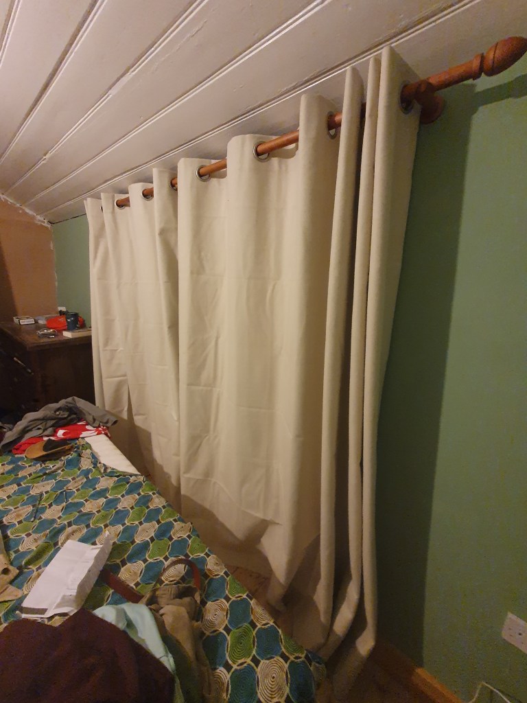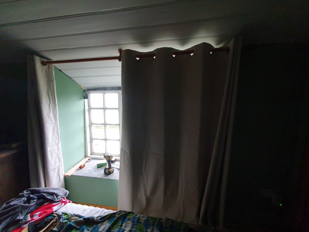 In the bedroom we finally installed a curtain. The curtain itself is second-hand, but I struggled to find a large enough wooden curtain pole nearby, so that ended up being new. Although the room is never particularly cold, you can now feel the temperature difference between the curtain and the window when they’re closed.