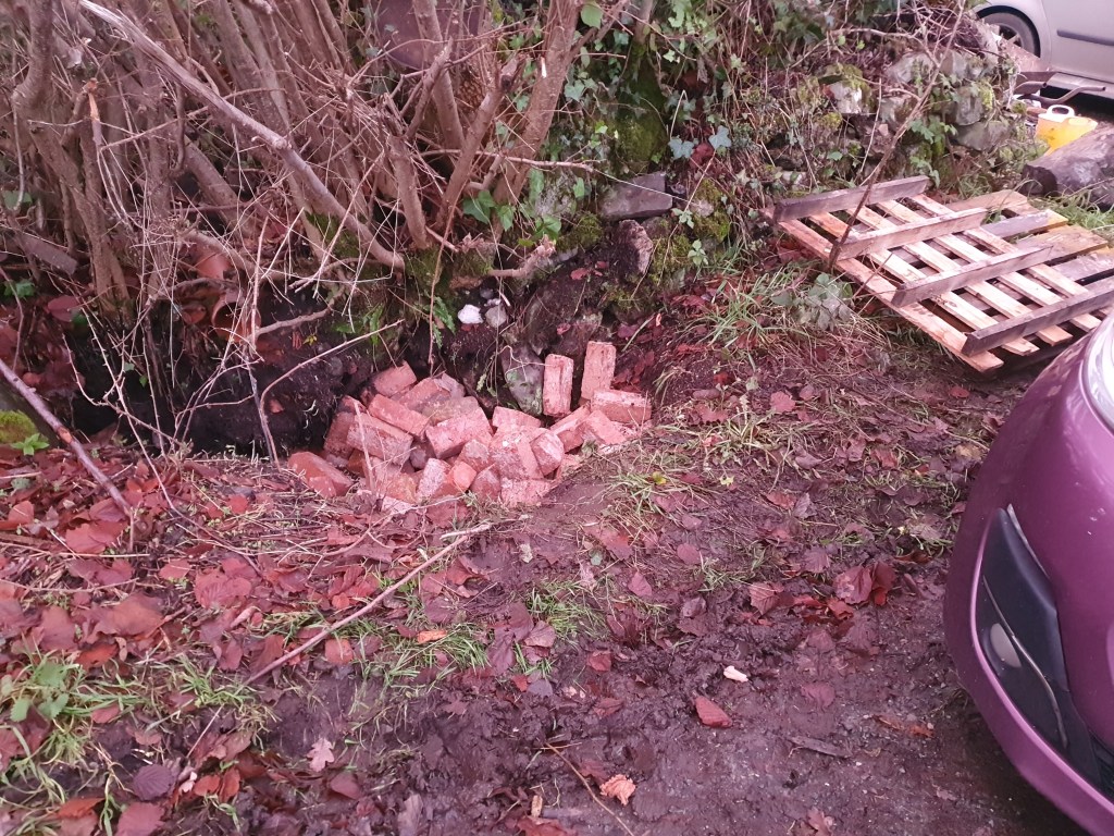 Although the sinkhole in the garden was filled during the drainage work, the end of the sinkhole next to the road has been expanding. Having informed the council and been told it wasn’t of concern, we thought we’d better sort it ourselves. Being all out of building waste Chris started throwing in a load of our bricks. It’s a shame to chuck perfectly good bricks into a hole in the ground, but we don’t need them and there’s been little interest on marketplace. And at least they’ll stop the car falling into a pit in the ground.