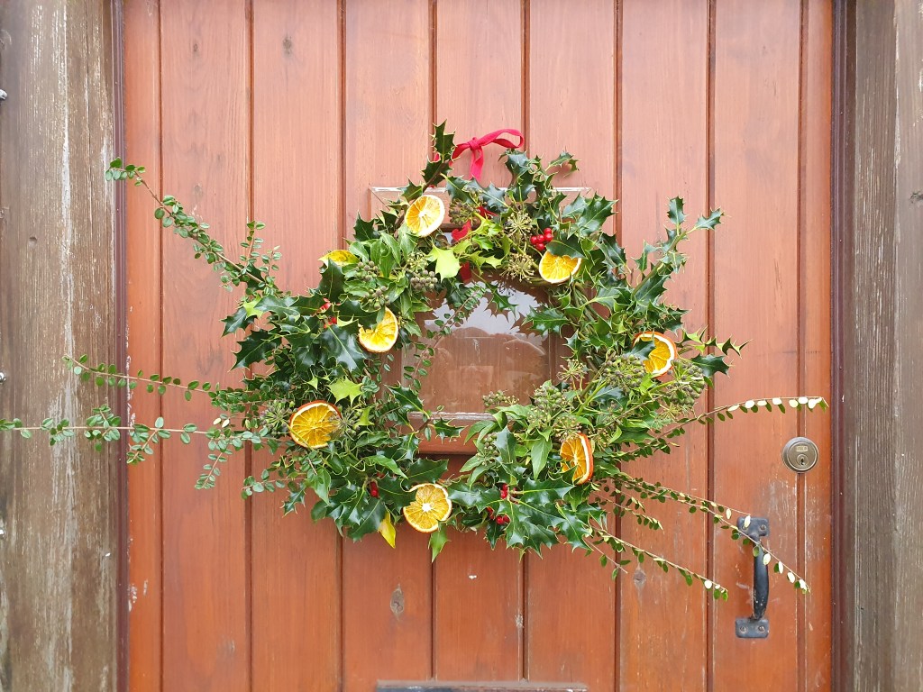 Because of this push we haven’t had much of a chance to get Christmassy. However, I took a bit of time to make a wreath for the door, with all the materials gathered from the garden (apart from the oranges). Phew at least that’s a little bit of Christmas spirit. Nadolig llawen as the Welsh would say.