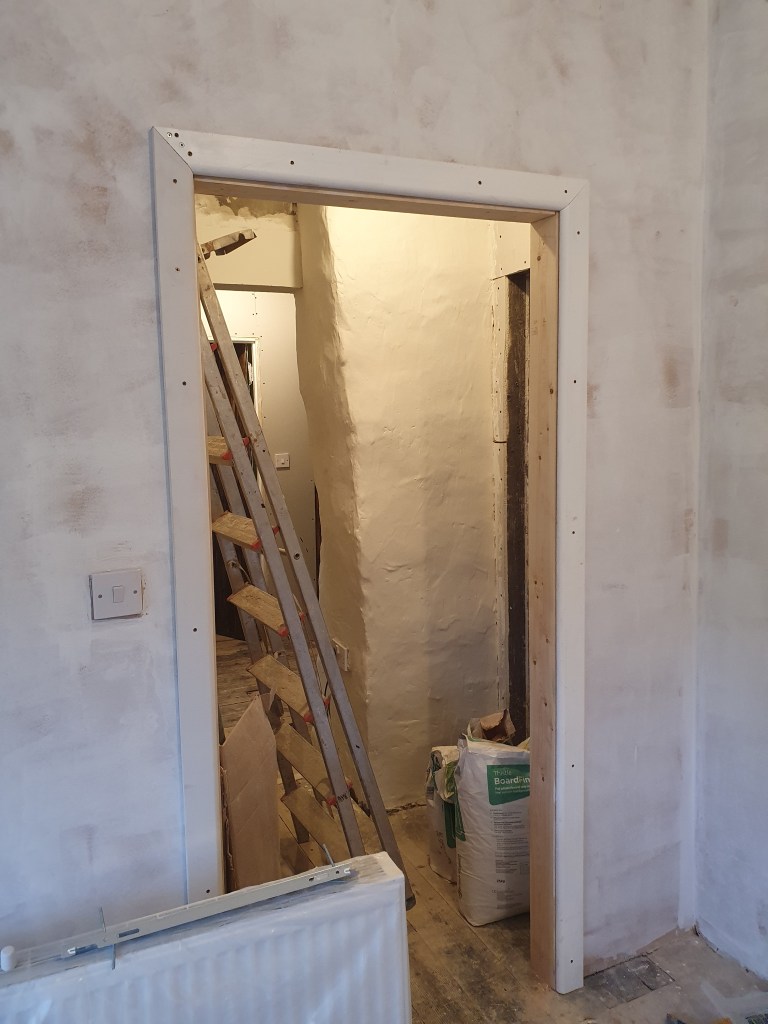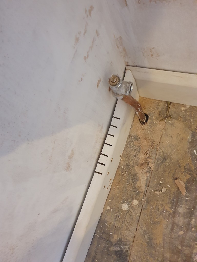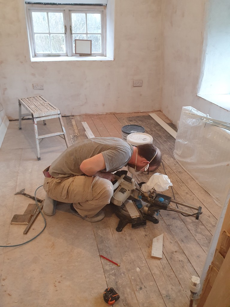 The plaster in the study now dry we sanded it down and put on the first watery coat of paint. Chris then did a great job getting all the skirting and architrave onto the wobbly walls. He’d seen a new technique where you cut little slits out of the back of the skirting so it can be bent around corners, and this seems to have worked well.