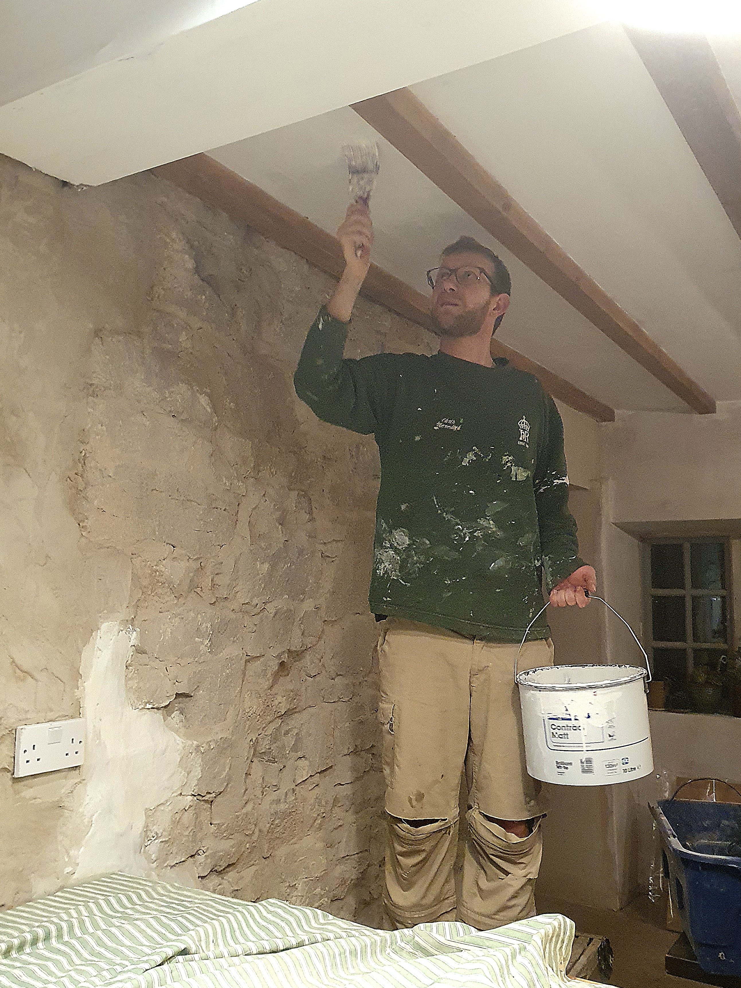 Having done the previous three coats of paint on the ceiling I passed the fourth coat on to Chris to do, who admitted that it was the worst kind of painting job.