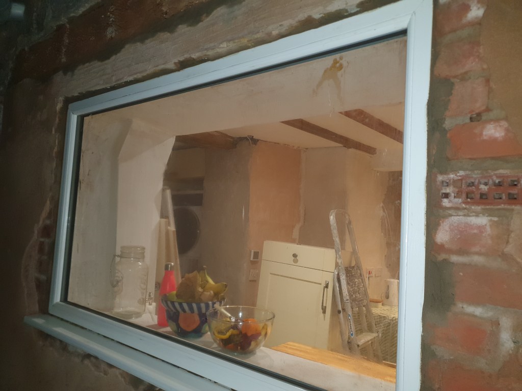 When we’d put in the windows at the back of the house we hadn’t gotten round to filling around them with mortar. Though it does need doing it hadn’t caused a big problem until the recent storms. While most of the windows just let in the wind, one of the kitchen windows started to let significant amounts of water in, leaking through the plasterboard. While it only occurred when the wind and rain was in storm conditions, it could very quickly cause significant problems. So the first dry evening I got out and plugged the gaps. Hopefully that’s the end of it, though there’s still four more unproblematic windows to do.