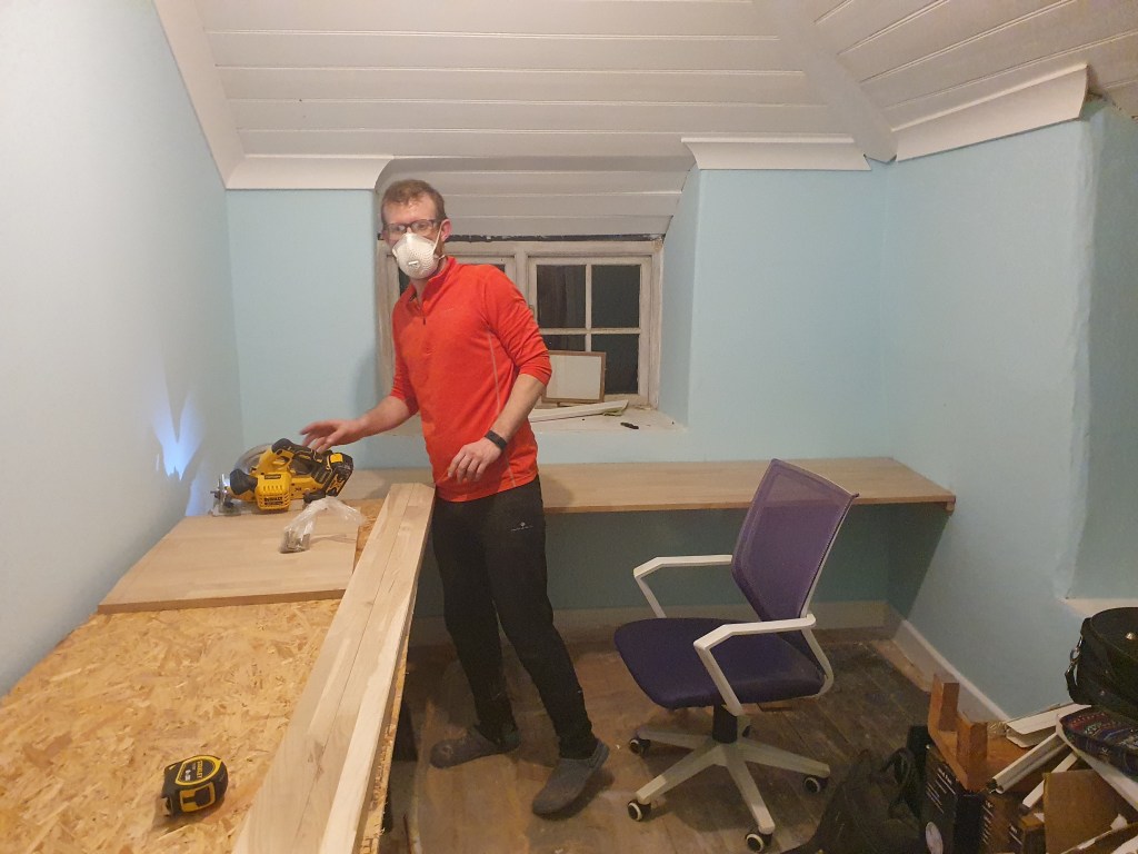 After I had dutifully written and posted my blog last weekend, Chris decided he hadn’t managed to get enough done afterall. Heading back upstairs after dinner he spent the evening creating sawdust as he cut and fitted the desk.
