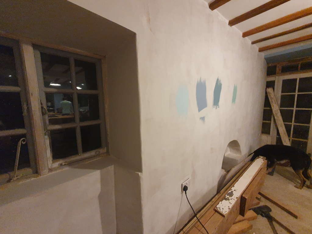 While Chris worked on the ventilation system in the attic, I got on with prepping the walls for plastering. I always forget how long the prep work takes, though it doesn’t seem like it should eat up so much time. I cut off the excess insulation foam, taped the joins, and then coated the walls with PVA.