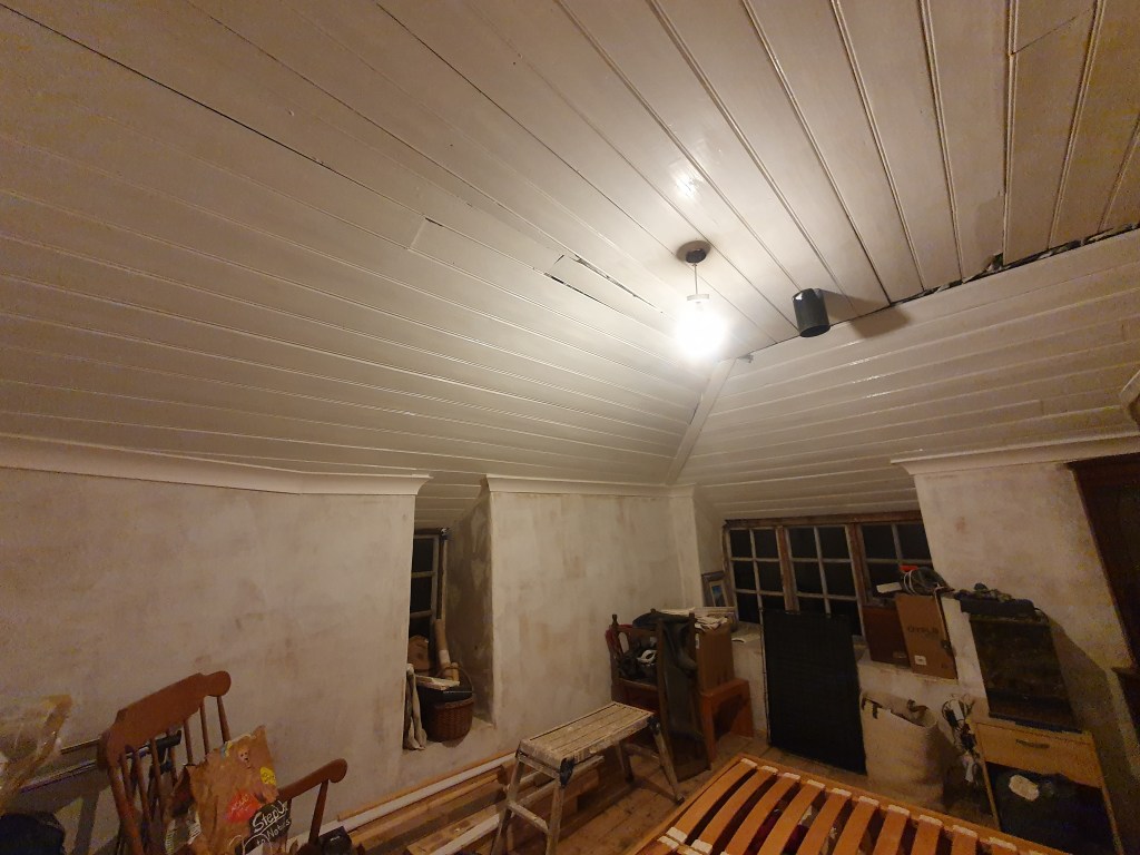 Coving up, I filled the gaps with filler, sanded it back, and added caulke where needed. Finally, the ceiling got another coat of paint and the coving it’s first coat.