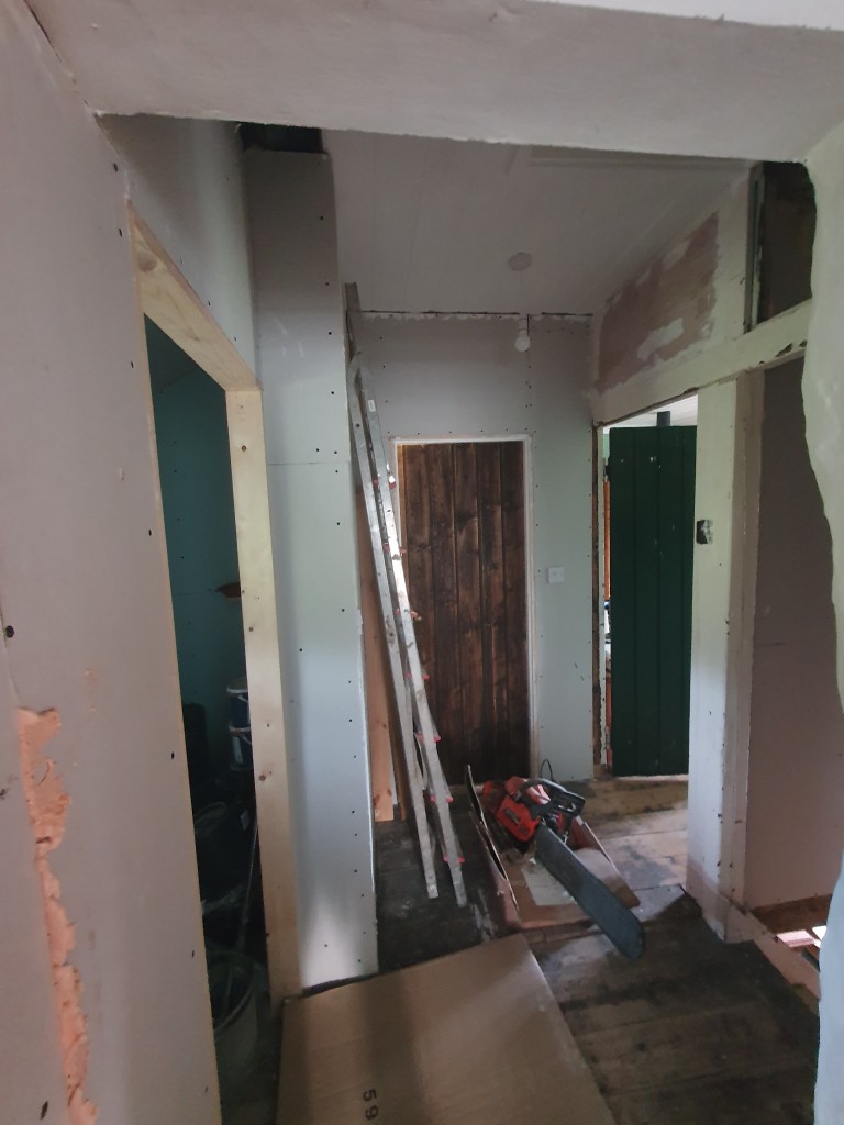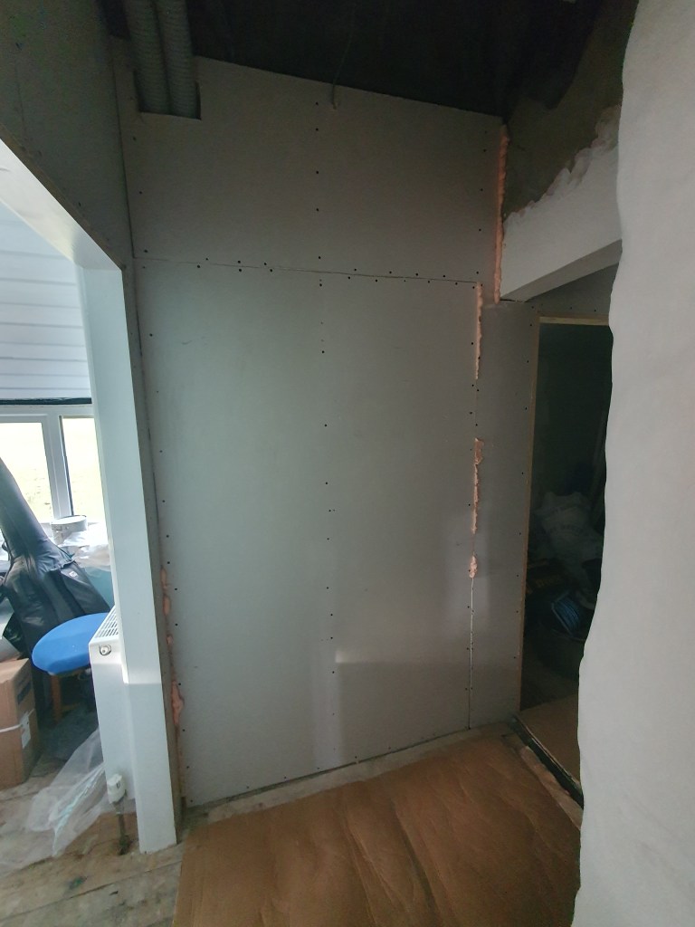 There was a small strip at the top of the wall on the stairs that still needed plasterboard adding. I wasn’t tall enough to fill the gaps, so Chris had to get up on the ladder to reach.