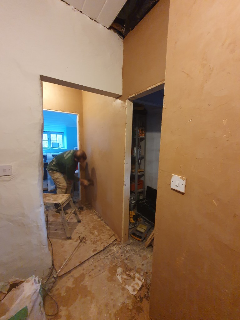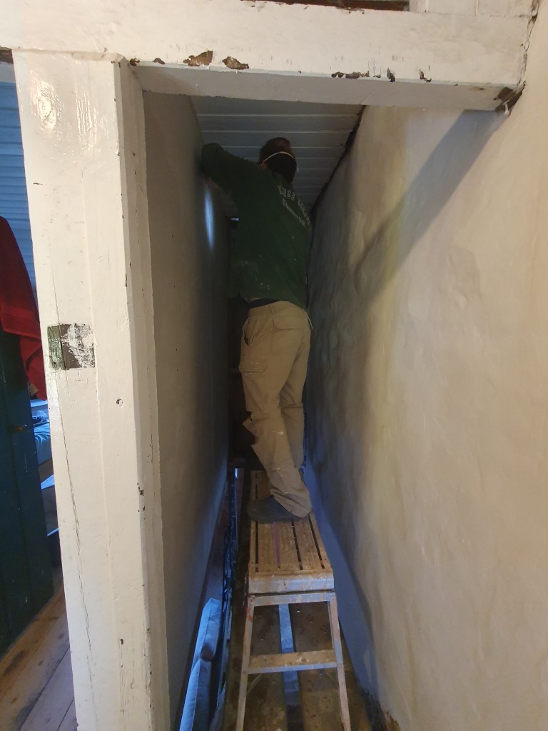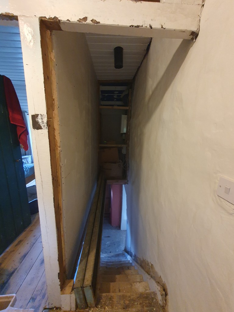 With the walls prepped we started plastering, with Chris getting the first coat on and me following to smooth it out. Even though it was a small space, all the different walls meant we only got the landing done, with the stairs having to wait for another day.