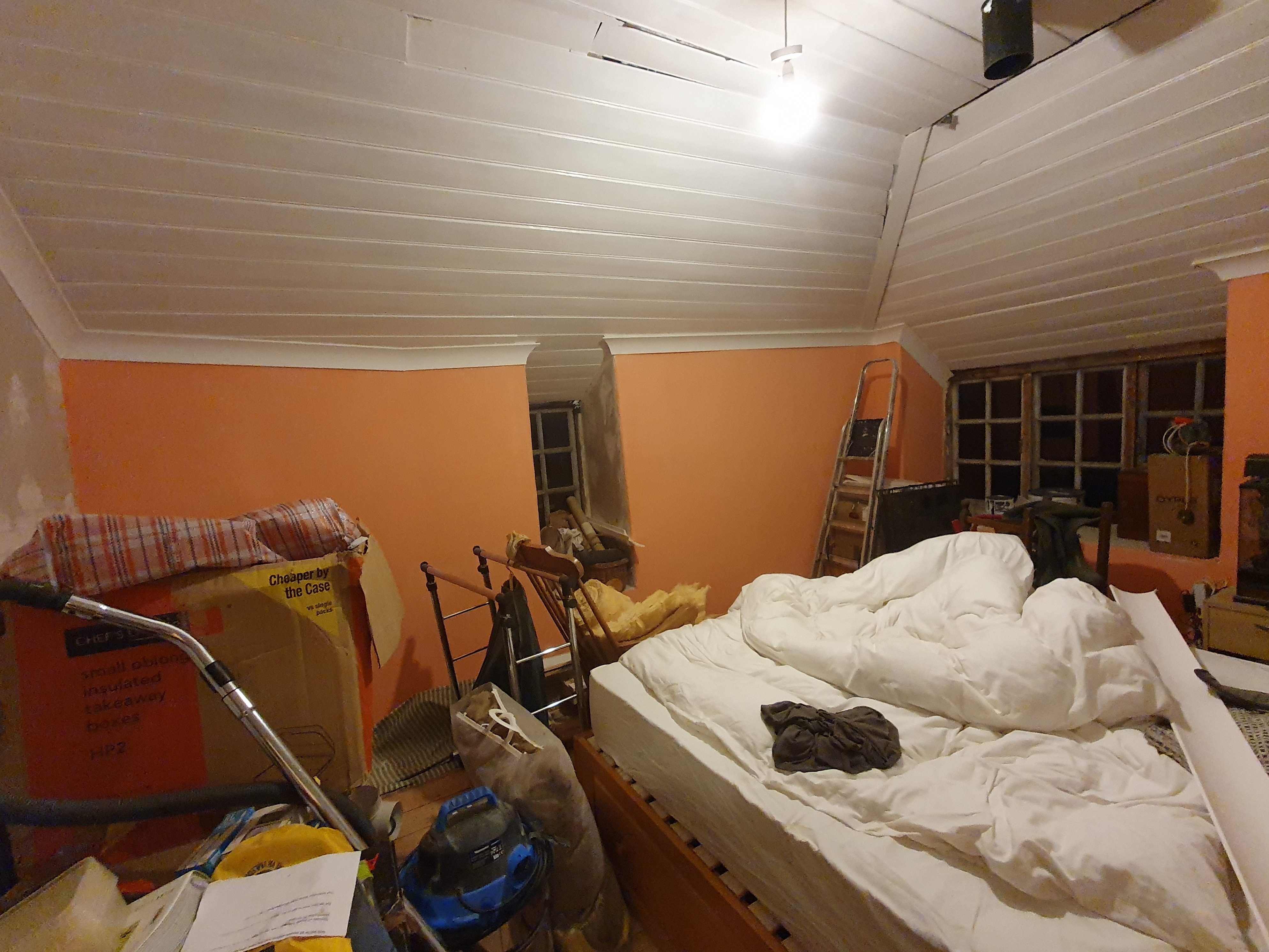One little job I decided to do was plug up the last of the gaps in the landing ceiling. The gaps were letting in cold air from the attic, so first I had to push in some insulation and then tape up the plastic lining. A few coats of paint and the new boards will fit right in.