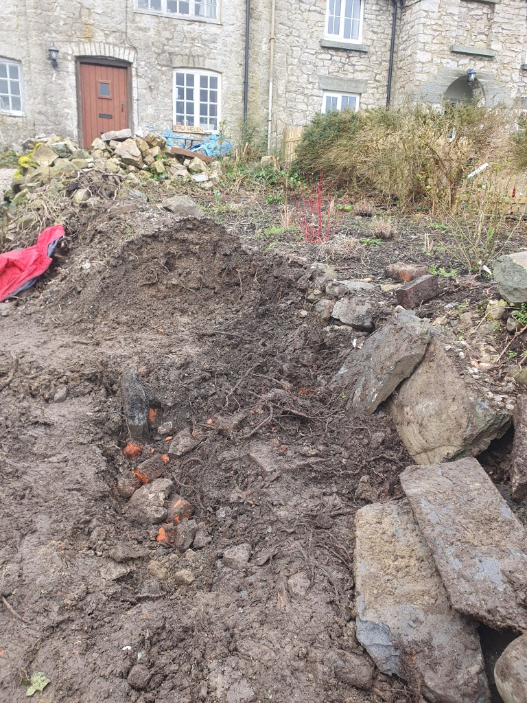 We found a line of big slate stones buried upright in a line, which probably once marked the edge of a wall. Chris spent a lot of time and energy digging them out. At some point we can repurpose them as garden steps.