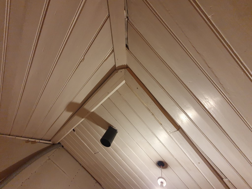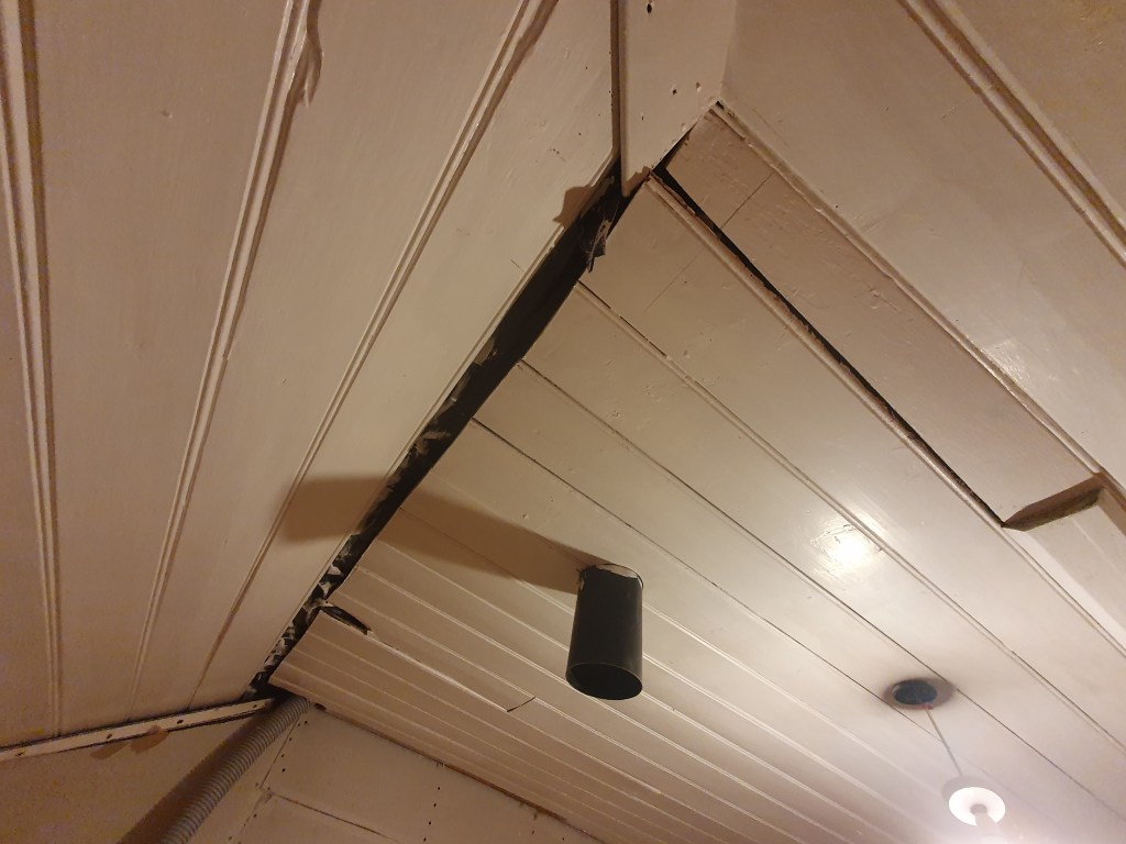 The main priority was to get the spare room finished. One fiddly job was putting up the wooden boards to cover the gaps in the ceiling. Once up they needed fill, sanding, and a final coat of paint.