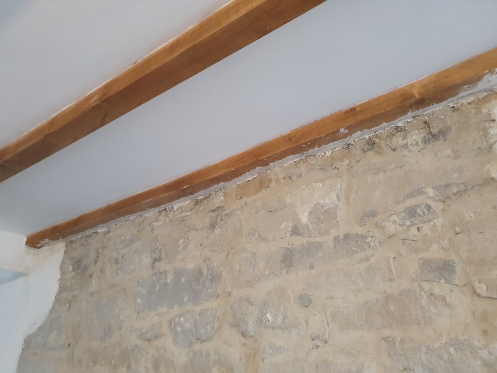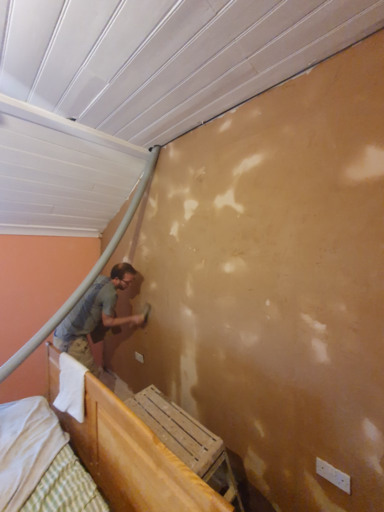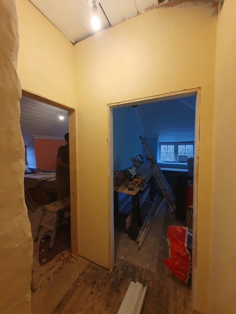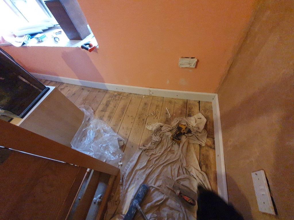While I worked on the landing, Chris started on the skirting in the bedroom, however the skirting can’t be attached to the new plaster just yet.